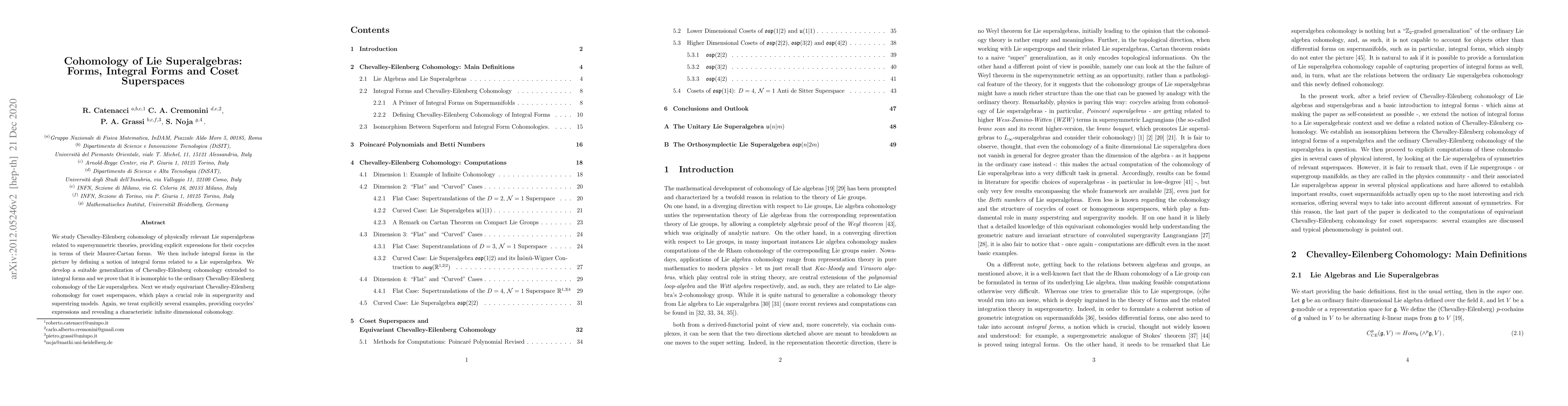 This paper investigates the Chevalley-Eilenberg cohomology of physically relevant Lie superalgebras, expressing cocycles in terms of Maurer-Cartan forms, introduces integral forms related to these superalgebras, and extends cohomology to these integral forms. It also examines equivariant cohomology for coset superspaces, essential in supergravity and superstring models, highlighting infinite-dimensional cohomologies.