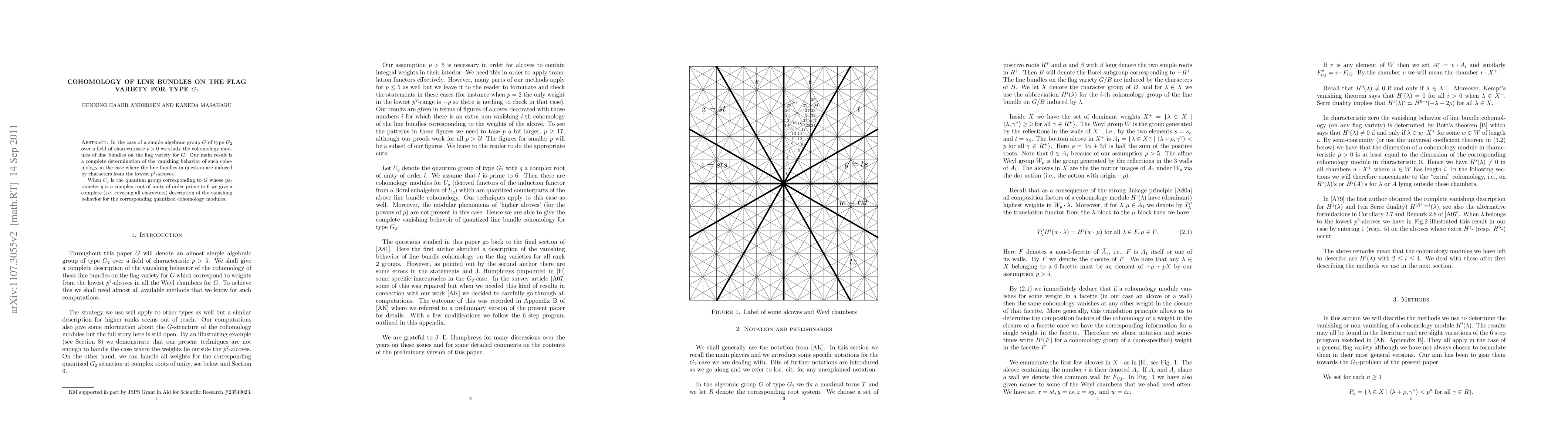 This paper investigates the cohomology of line bundles on the flag variety for the algebraic group $G$ of type $G_2$ in characteristic $p>0$. The authors determine the vanishing behavior of these cohomology modules for line bundles induced by characters from the lowest $p^2$-alcoves. Additionally, they provide a complete description of the vanishing behavior for quantized cohomology modules corresponding to the quantum group $U_q$ when $q$ is a complex root of unity.