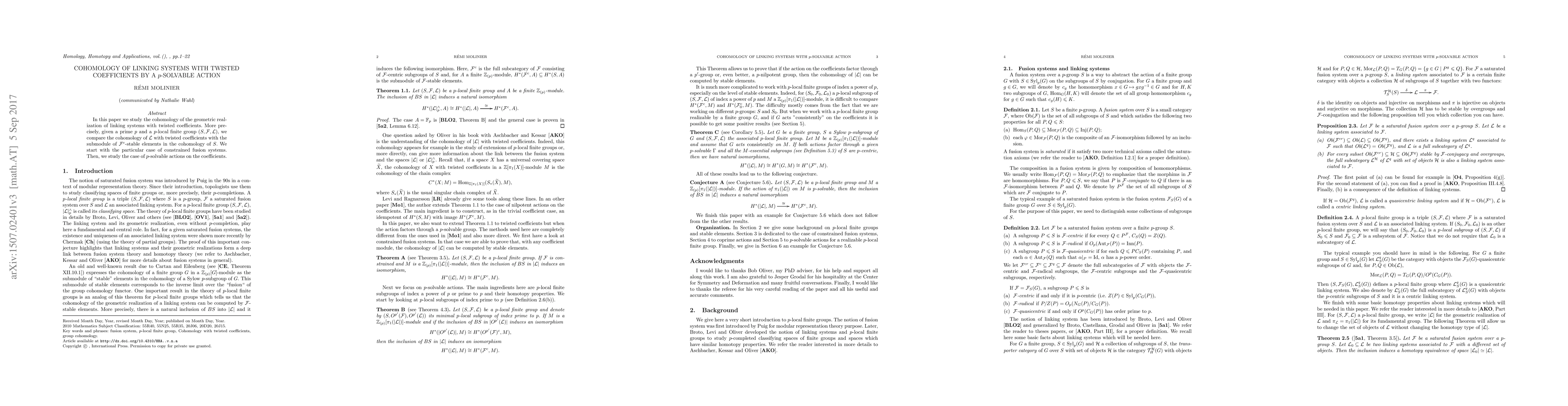 This paper investigates the cohomology of linking systems realized geometrically, focusing on twisted coefficients under a $p$-solvable group action. It compares the cohomology with twisted coefficients of $\mathcal{L}$ to the $\mathcal{F}^c$-stable elements in the cohomology of $S$, particularly in constrained fusion systems and $p$-solvable coefficient scenarios.