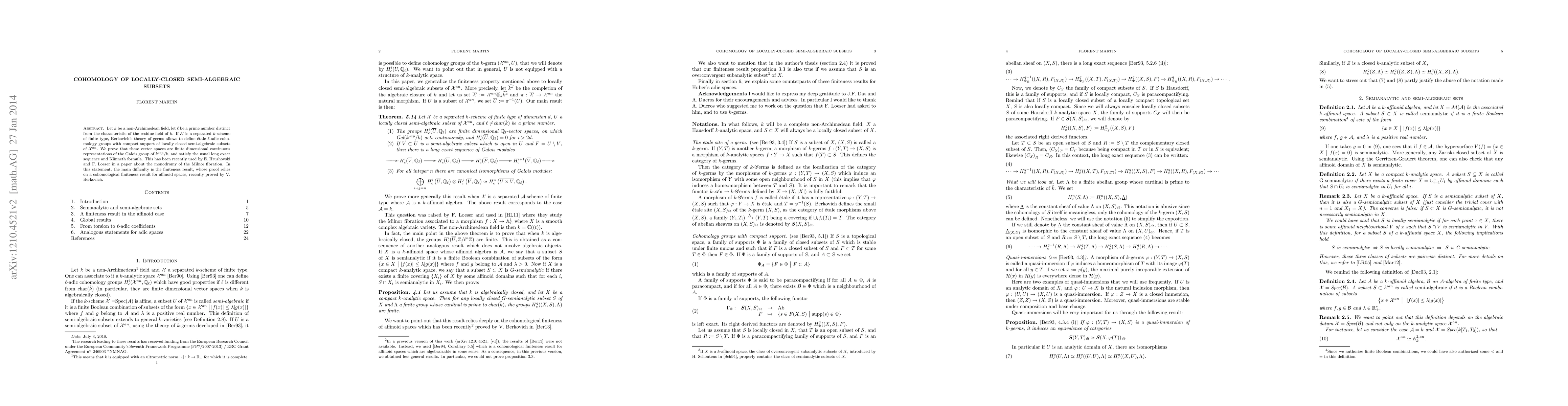 Let k be a non archimedean field. If X is a k-algebraic variety and U a locally closed semi-algebraic subset of X^{an} -- the Berkovich space associated to X -- we show that for l \neq char(\tilde{k}), the cohomology groups H^i_c (\bar{U}, Q_l) behave like H^i_c(\bar{X}, Q_l), where \bar{U} = U \otimes \hat{\bar{k}}. In particular, they are finite-dimensional vector spaces. This result has been used by E. Hrushovski and F. Loeser. Moreover, we prove analogous finiteness properties concerning rigid semi-analytic subsets of compact Berkovich spaces (resp. adic spaces associated to quasi-compact quasi-separated k-rigid spaces) when char(\tilde{k}) \neq 0 (resp in any characteristic).