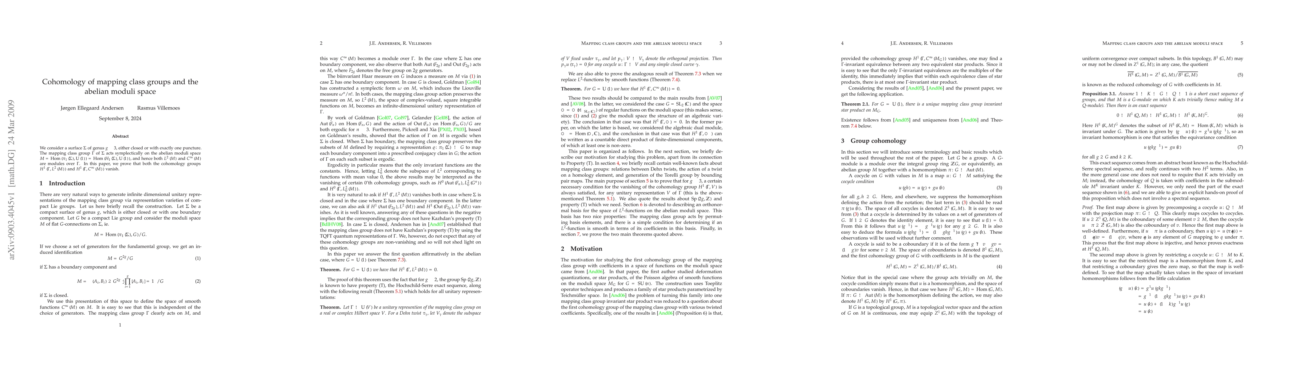 This paper investigates the action of the mapping class group on the abelian moduli space of a surface, showing that both $H^1(\Gamma, L^2(M))$ and $H^1(\Gamma, C^\infty(M))$ cohomology groups vanish.