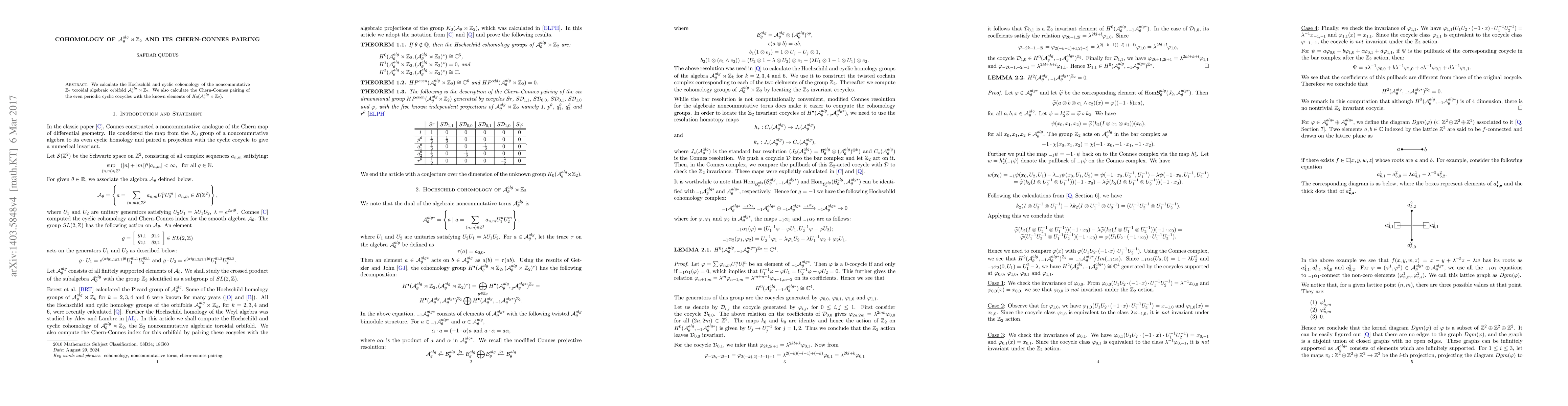We calculate the Hochschild and cyclic cohomology of the $\mathbb Z_2$ toroidal orbifold $\mathcal A_\theta^{alg} \rtimes \mathbb Z_2$. We also calculate the Chern-Connes pairing of the even cyclic cohomology group with the known elements of $K_0(\mathcal A_\theta^{alg} \rtimes \mathbb Z_2)$.