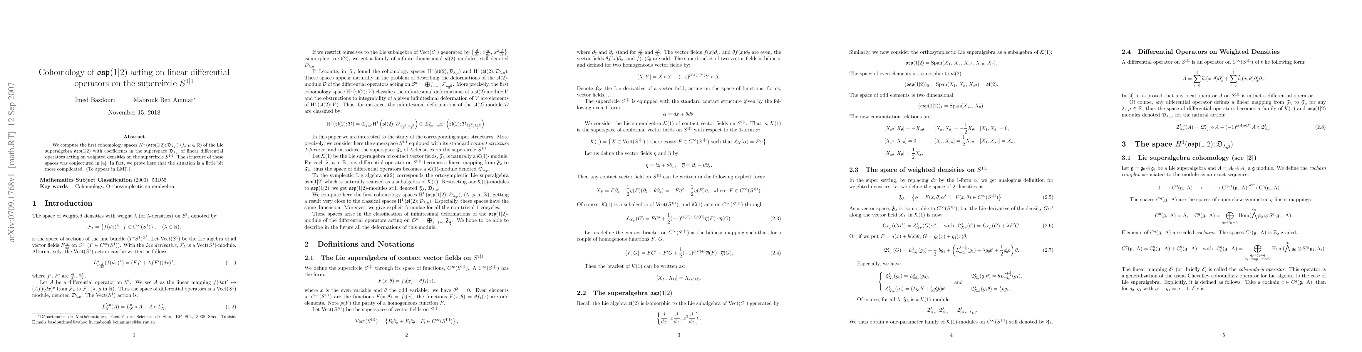 We compute the first cohomology spaces $H^1(\mathfrak{osp}(1|2);\mathfrak{D}_{\lambda,\mu})$ ($\lambda, \mu\in\mathbb{R}$) of the Lie superalgebra $\mathfrak{osp}(1|2)$ with coefficients in the superspace $\mathfrak{D}_{\lambda,\mu}$ of linear differential operators acting on weighted densities on the supercircle $S^{1|1}$. The structure of these spaces was conjectured in \cite{gmo}. In fact, we prove here that the situation is a little bit more complicated. (To appear in LMP.)
