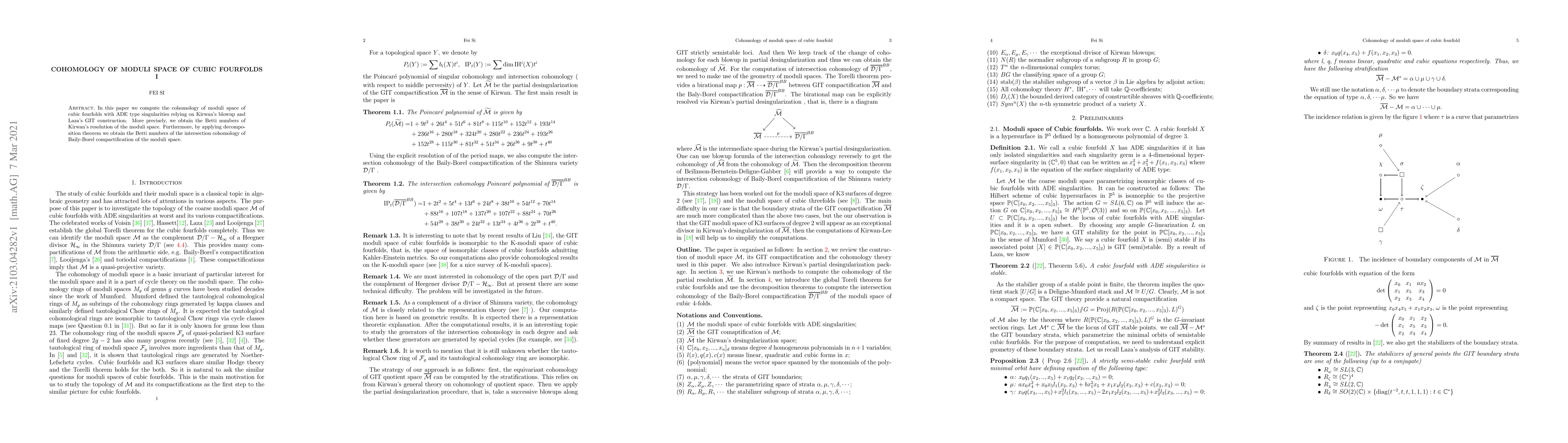 This paper computes the cohomology of the moduli space of cubic fourfolds with ADE singularities using Kirwan's blowup and Laza's GIT construction, obtaining Betti numbers for Kirwan's resolution and intersection cohomology for Baily-Borel compactification via the decomposition theorem.