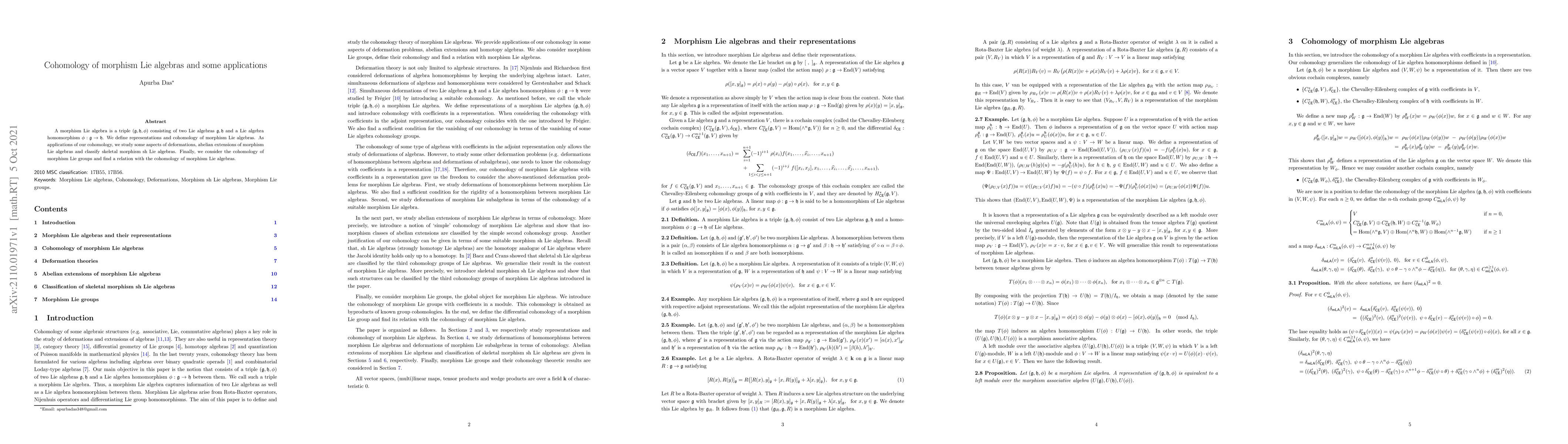 This paper defines representations and cohomology for morphism Lie algebras, applying the cohomology to study deformations, abelian extensions, and classification of skeletal morphism sh Lie algebras. It also explores the cohomology of morphism Lie groups and establishes a connection between the two.