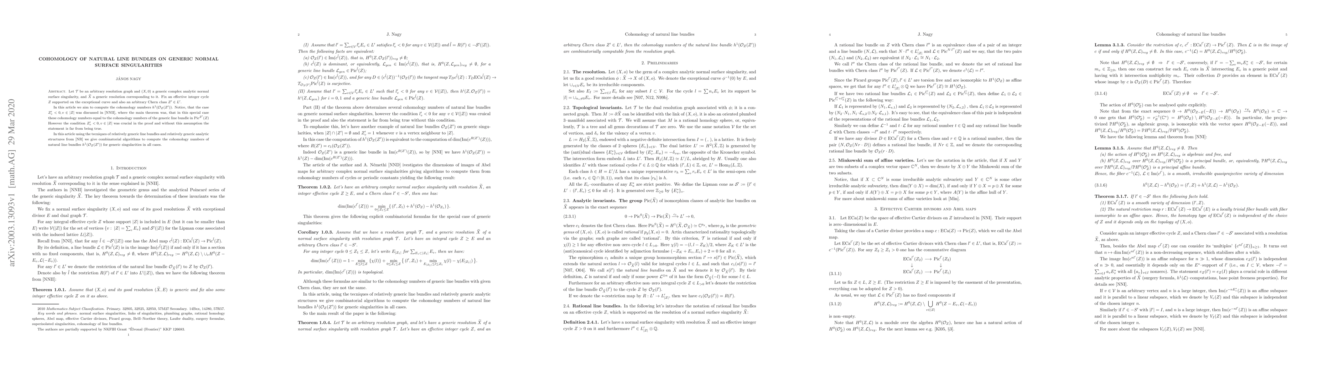 The paper introduces combinatorial algorithms for computing cohomology numbers $h^1(\mathcal{O}_{Z}(Z'))$ for natural line bundles on generic normal surface singularities, extending previous work by removing a crucial restriction.
