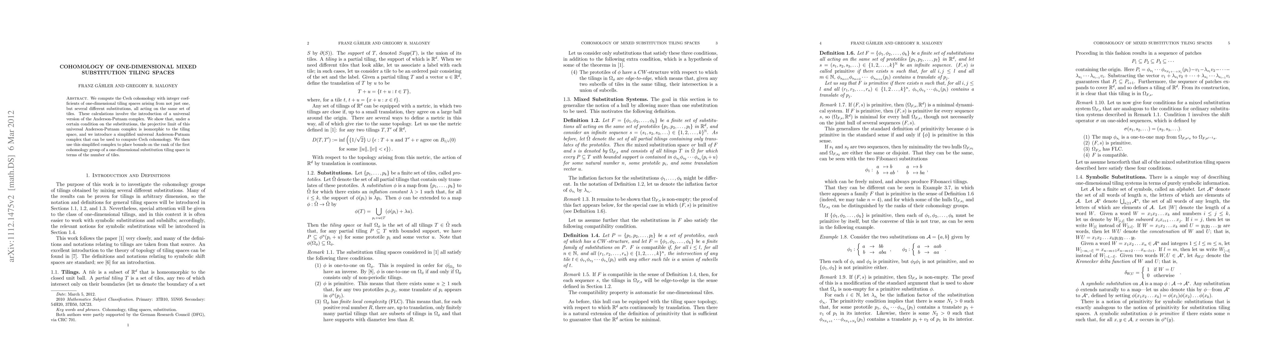 This paper computes the Cech cohomology of one-dimensional tiling spaces generated by multiple substitutions using a simplified Anderson-Putnam complex, establishing bounds on the first cohomology's rank relative to the number of tiles under specific substitution conditions.