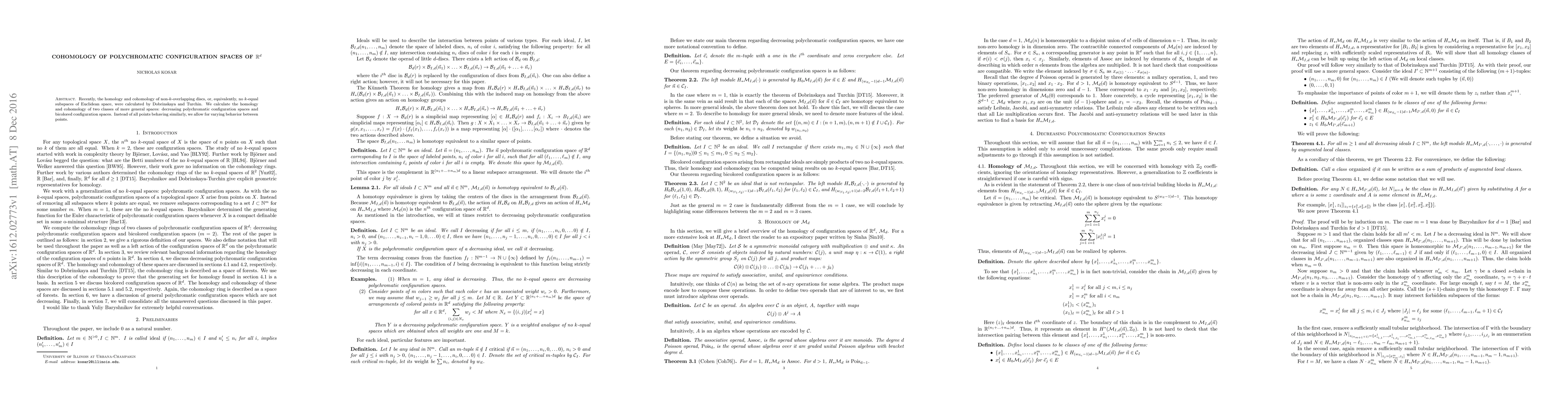 Title: Cohomology of Polychromatic Configuration Spaces of Euclidean Space Summary: This paper extends previous work on the homology and cohomology of non-overlapping discs by calculating the cohomology of more complex configuration spaces where points exhibit varying behavior, specifically focusing on decreasing polychromatic and bicolored configuration spaces.
