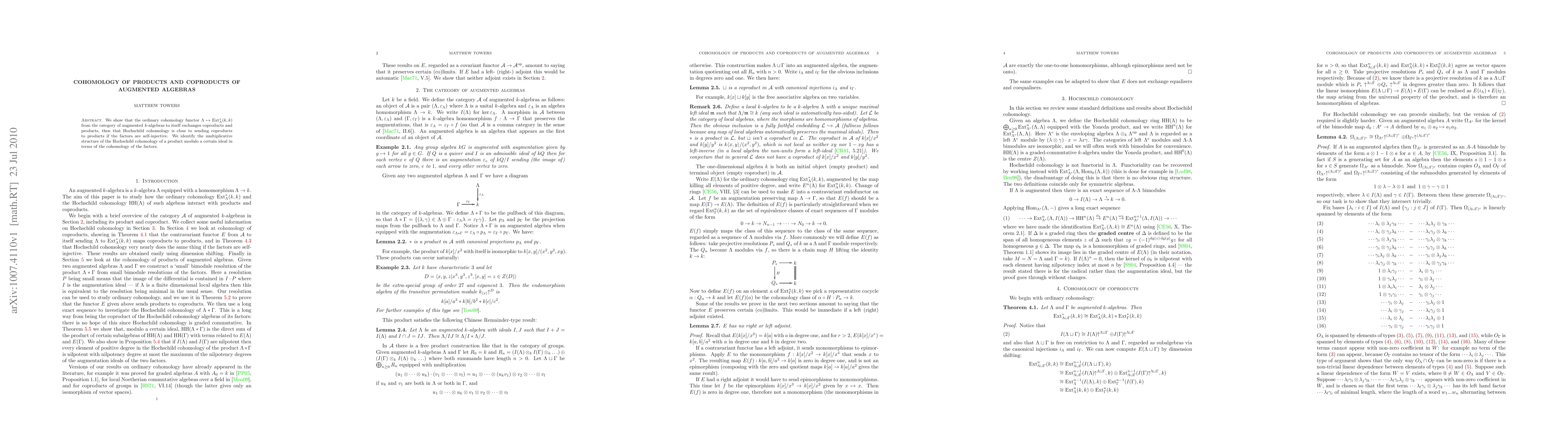 We show that the ordinary cohomology functor from the category of augmented $k$-algebras to itself exchanges coproducts and products, and that Hochschild cohomology is close to sending coproducts to products if the factors are self-injective. We identify the multiplicative structure of the Hochschild cohomology of a product modulo a certain ideal in terms of the cohomology of the factors.