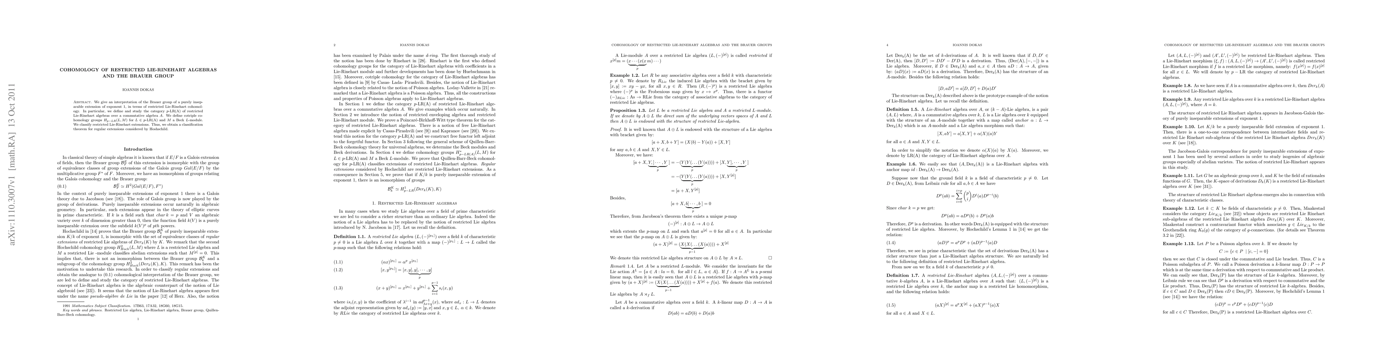We give an interpretation of the Brauer group of a purely inseparable extension of exponent 1, in terms of restricted Lie-Rinehart cohomology. In particular, we define and study the category $p$-$\rm{LR}(A)$ of restricted Lie-Rinehart algebras over a commutative algebra $A$. We define cotriple cohomology groups $H_{p-LR}(L,M)$ for $L\in p$-$\rm{LR}(A)$ and $M$ a Beck $L$-module. We classify restricted Lie-Rinehart extensions. Thus, we obtain a classification theorem for regular extensions considered by Hoshschild.