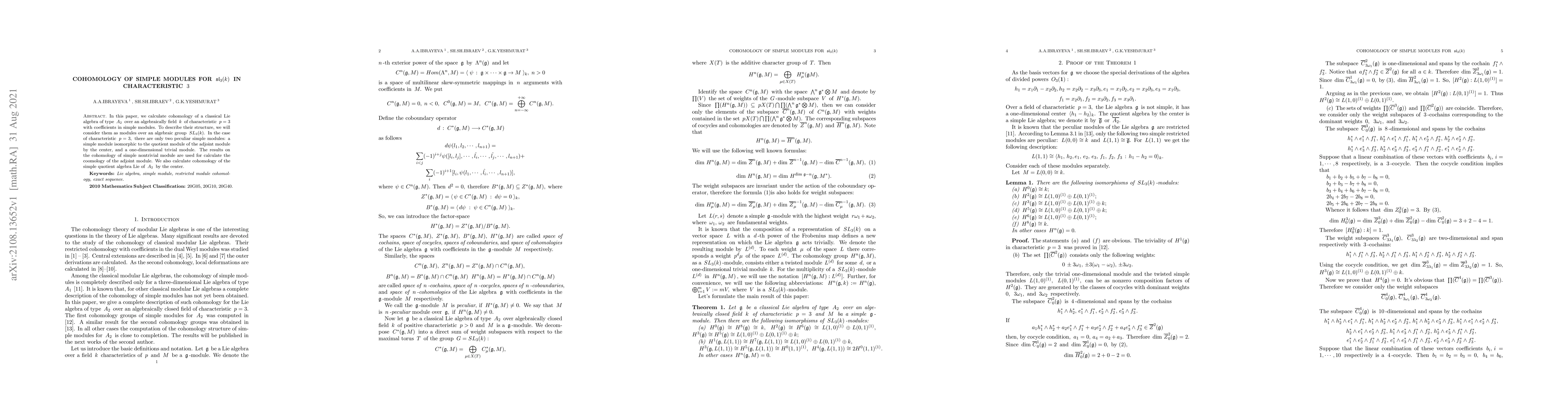 In this paper, we calculate cohomology of a classical Lie algebra of type $A_2$ over an algebraically field $k$ of characteristic $p=3$ with coefficients in simple modules. To describe their structure, we will consider them as modules over an algebraic group $SL_3(k).$ In the case of characteristic $p=3,$ there are only two peculiar simple modules: a simple module isomorphic to the quotient module of the adjoint module by the center, and a one-dimensional trivial module. The results on the cohomology of simple nontrivial module are used for calculate the coomology of the adjoint module. We also calculate cohomology of the simple quotient algebra Lie of $A_2$ by the center.