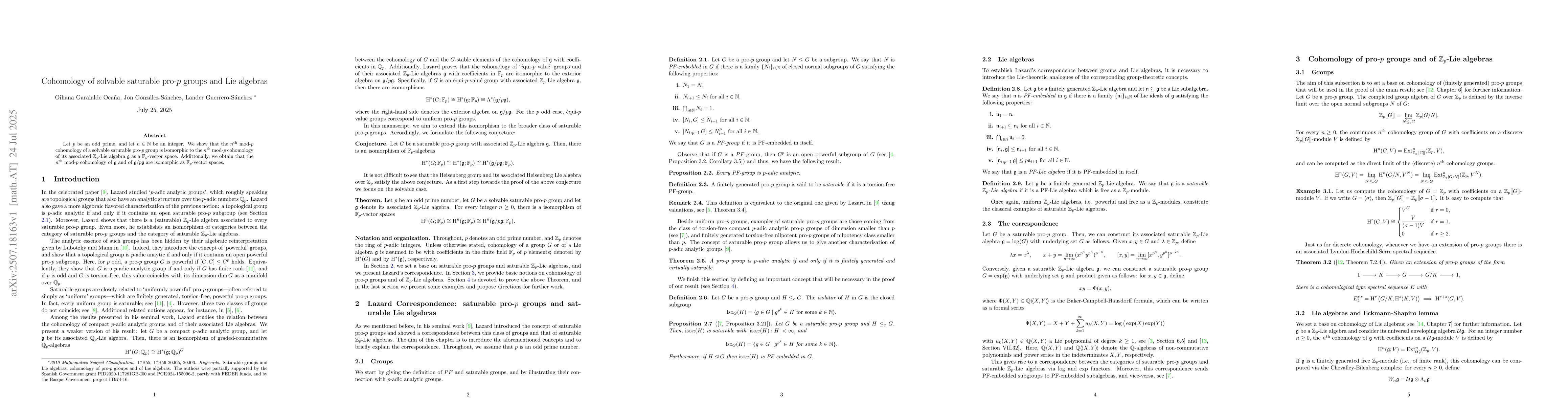 Let $p$ be an odd prime, and let $n\in \N$ be an integer. We show that the $n^{\text{th}}$ mod-$p$ cohomology of a solvable saturable pro-$p$ group is isomorphic to the $n^{\text{th}}$ mod-$p$ cohomology of its associated $\Z_p$-Lie algebra $\g$ as a $\F_p$-vector space. Addittonally, we obtain that the $n^{\text{th}}$ mod-$p$ cohomology of $\g$ and of $\g/p\g$ are isomorphic as $\F_p$-vector spaces.