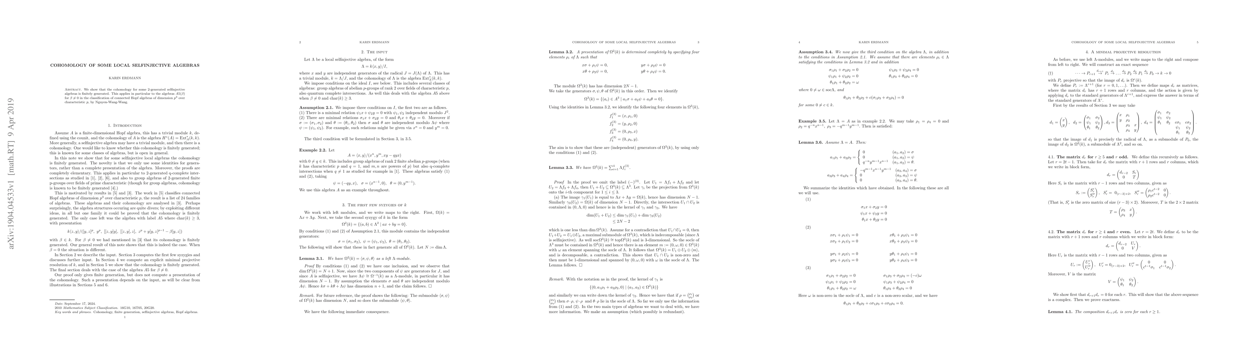 We show that the cohomology for some 2-generated selfinjective algebras is finitely generated. This applies in particular to the algebras $A5(\beta)$ for $\beta\neq 0$ in the classification of connected Hopf algebras of dimension $p^3$ over characteristic $p$ by Nguyen-Wang-Wang.