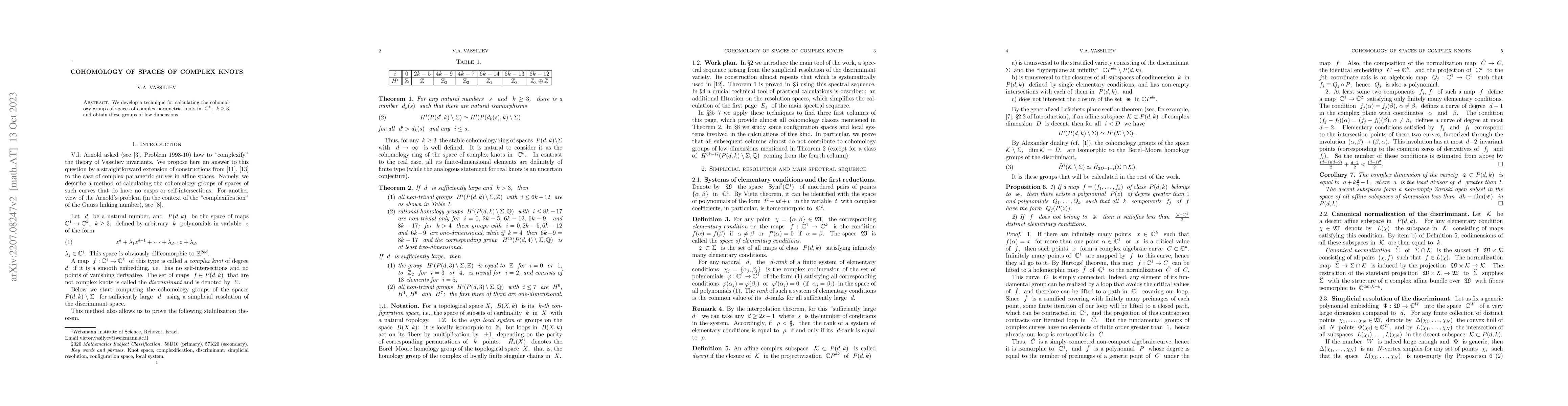 This paper introduces a method for determining the cohomology groups of spaces of complex parametric knots in ${\mathbb C}^k$ for $k \geq 3$, and applies this technique to compute the cohomology groups in lower dimensions.