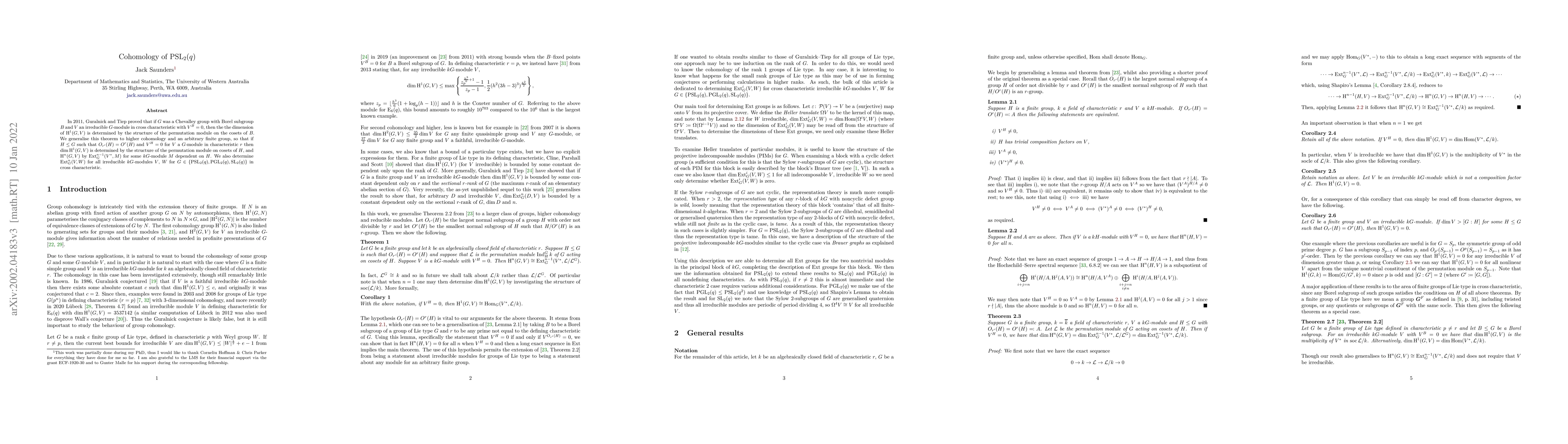 In 2011, Guralnick and Tiep proved that if $G$ was a Chevalley group with Borel subgroup $B$ and $V$ an irreducible $G$-module in cross characteristic with $V^B = 0$, then the the dimension of $H^1(G,V)$ is determined by the structure of the permutation module on the cosets of $B$. We generalise this theorem to higher cohomology and an arbitrary finite group, so that if $H \leq G$ such that $O_{r'}(H) = O^r(H)$ and $V^H = 0$ for $V$ a $G$-module in characteristic $r$ then $\dim H^1(G,V)$ is determined by the structure of the permutation module on cosets of $H$, and $H^n(G,V)$ by $\text{Ext}_G^{n-1}(V^*,M)$ for some $kG$-module $M$ dependent on $H$. We also determine $\text{Ext}_G^n(V,W)$ for all irreducible $kG$-modules $V$, $W$ for $G \in \{\text{PSL}_2(q), \text{PGL}_2(q), \text{SL}_2(q)\}$ in cross characteristic.
