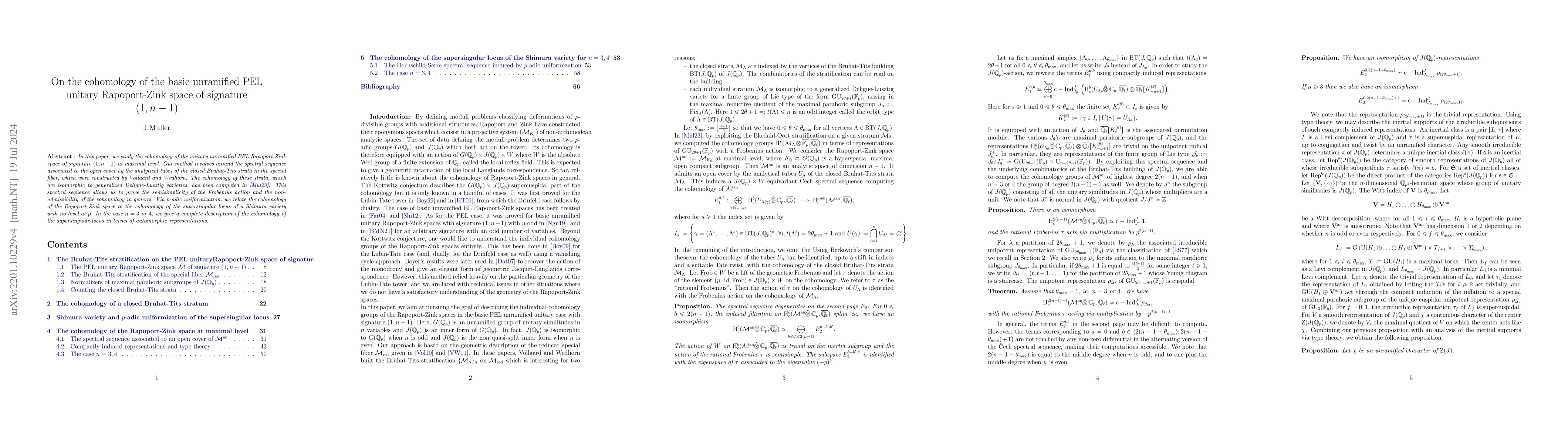 In this paper, we study the cohomology of the unitary unramified PEL Rapoport-Zink space of signature $(1,n-1)$ at maximal level. Our method revolves around the spectral sequence associated to the open cover by the analytical tubes of the closed Bruhat-Tits strata in the special fiber, which were constructed by Vollaard and Wedhorn. The cohomology of these strata, which are isomorphic to generalized Deligne-Lusztig varieties, has been computed in arXiv:2110.00614 [math.RT]. This spectral sequence allows us to prove the semisimplicity of the Frobenius action and to describe the inertial supports of the irreducible subquotients in the individual cohomology groups. In particular, when $n\geq 5$ no such subquotient is supercuspidal, but when $1\leq n \leq 4$ supercuspidal subquotients do occur. Moreover, we also prove that the cohomology groups need not be admissible in general. Via $p$-adic uniformization, we relate the cohomology of the Rapoport-Zink space to the cohomology of the basic stratum of a Shimura variety with no level at $p$. In the case $n=3$ or $4$, we give a complete description of the cohomology of the basic stratum in terms of automorphic representations. In particular, some automorphic representations occur with multiplicities dependent on $p$.