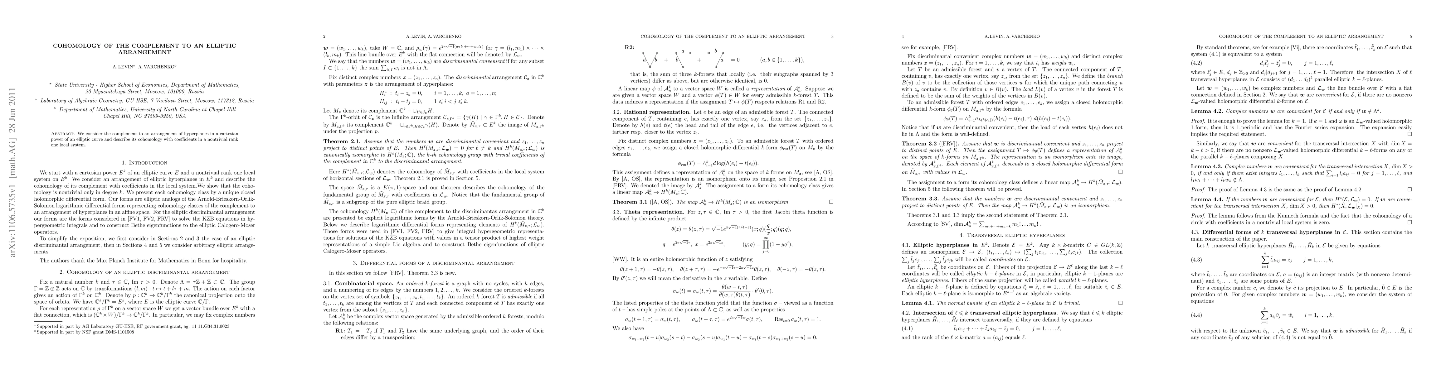 This paper explores the cohomology of the complement to an elliptic arrangement in a cartesian power of an elliptic curve, focusing on its properties with nontrivial rank one local systems.