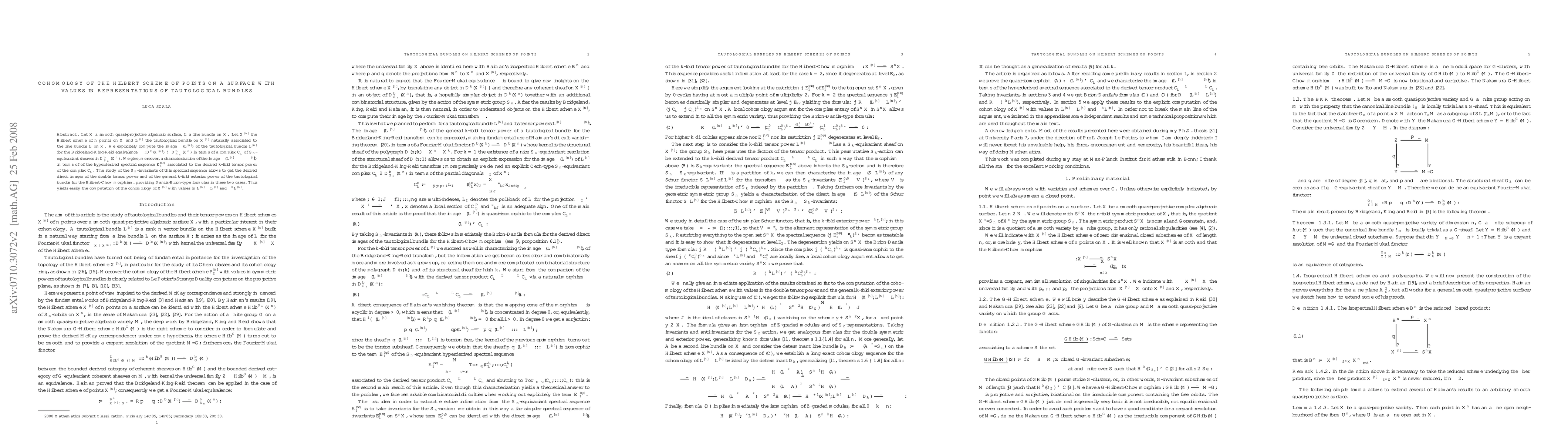 Let $X$ a smooth quasi-projective algebraic surface, $L$ a line bundle on $X$. Let $X^{[n]}$ the Hilbert scheme of $n$ points on $X$ and $L^{[n]}$ the tautological bundle on $X^{[n]}$ naturally associated to the line bundle $L$ on $X$. We explicitely compute the image $\bkrh(L^{[n]})$ of the tautological bundle $L^{[n]}$ for the Bridgeland-King-Reid equivalence $\bkrh : \B{D}^b(X^{[n]}) \ra \B{D}^b_{\perm_n}(X^n)$ in terms of a complex $\comp{\mc{C}}_L$ of $\perm_n$-equivariant sheaves in $\B{D}^b_{\perm_n}(X^n)$. We give, moreover, a characterization of the image $\bkrh(L^{[n]} \tens ... \tens L^{[n]})$ in terms of of the hyperderived spectral sequence $E^{p,q}_1$ associated to the derived $k$-fold tensor power of the complex $\comp{\mc{C}}_L$. The study of the $\perm_n$-invariants of this spectral sequence allows to get the derived direct images of the double tensor power and of the general $k$-fold exterior power of the tautological bundle for the Hilbert-Chow morphism, providing Danila-Brion-type formulas in these two cases. This yields easily the computation of the cohomology of $X^{[n]}$ with values in $L^{[n]} \tens L^{[n]}$ and $\Lambda^k L^{[n]}$.