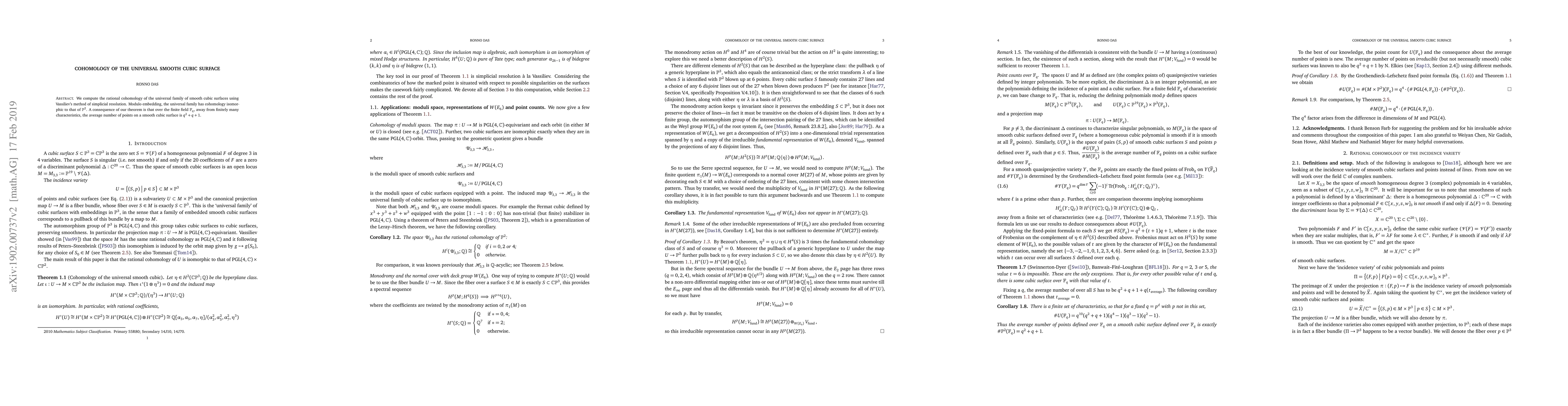 This paper computes the rational cohomology of the universal smooth cubic surface using Vassiliev's simplicial resolution method, showing it is isomorphic to $\mathbb{P}^2$'s cohomology. The result implies that over $\mathbb{F}_q$, the average number of points on a smooth cubic surface is $q^2 + q + 1$ away from specific characteristics.