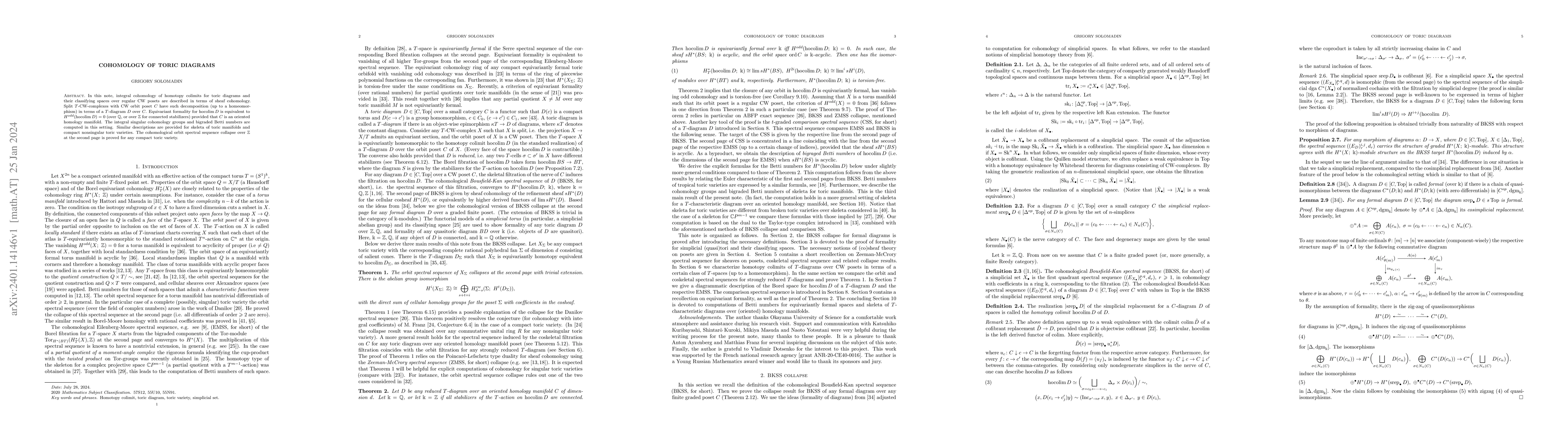 This paper explores the integral cohomology of homotopy colimits for toric diagrams, showing their equivalence to sheaf cohomology. It establishes equivariant formality conditions and computes the integral singular cohomology groups and bigraded Betti numbers for toric manifolds and varieties, proving the cohomological orbit spectral sequence collapse for any compact toric variety.