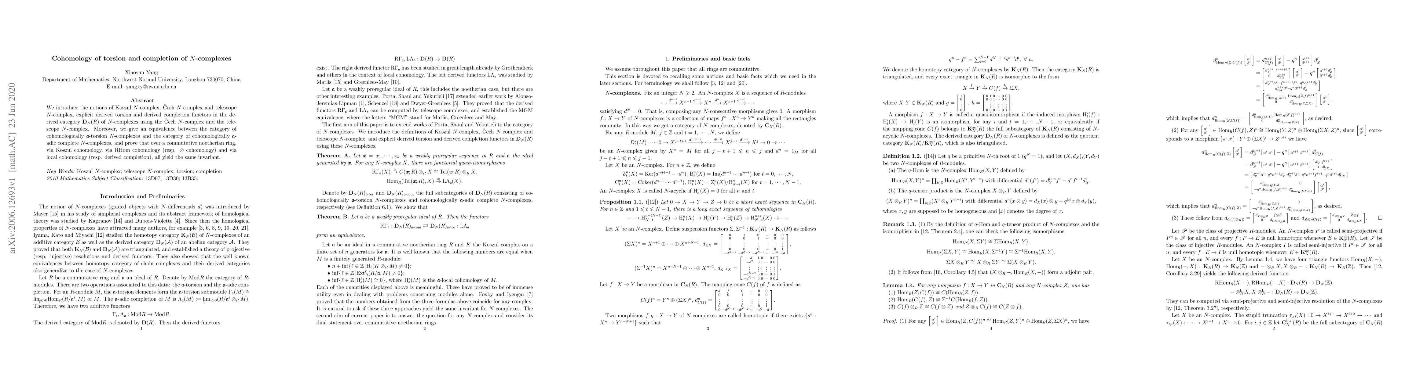 This paper introduces various $N$-complexes and their associated cohomology theories, establishing equivalences between cohomologically torsion and complete $N$-complexes. It demonstrates that multiple cohomology methods yield the same invariant over commutative noetherian rings.