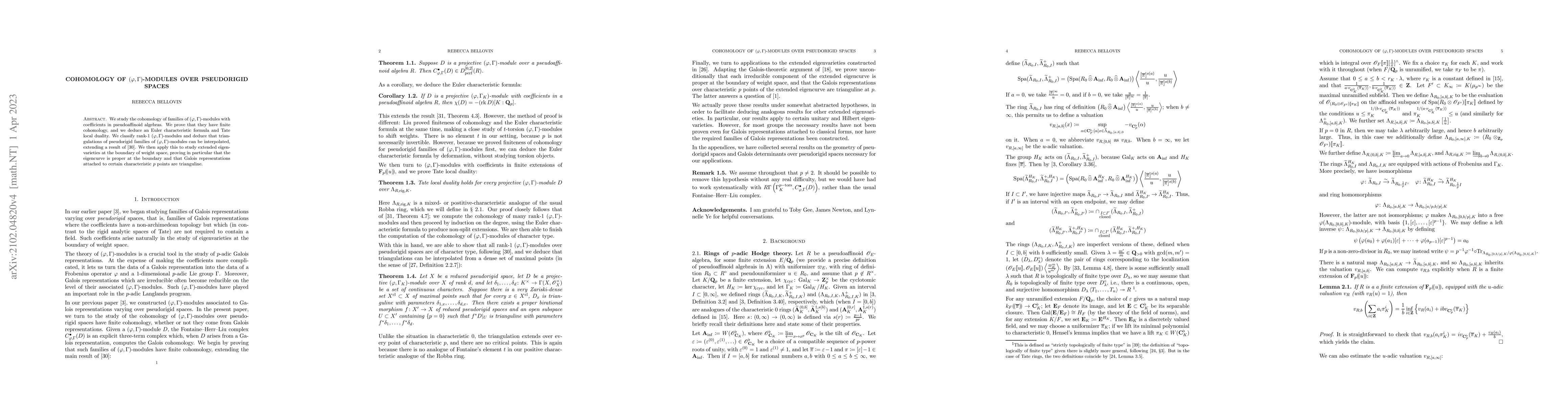This paper investigates the cohomology of $(\varphi,\Gamma)$-modules over pseudorigid spaces, proving finite cohomology and establishing Euler characteristic formulas and Tate local duality. It also classifies rank-$1$ modules and extends triangulation results, applying these findings to demonstrate the properness of eigencurves at boundary points and the trianguline nature of Galois representations.