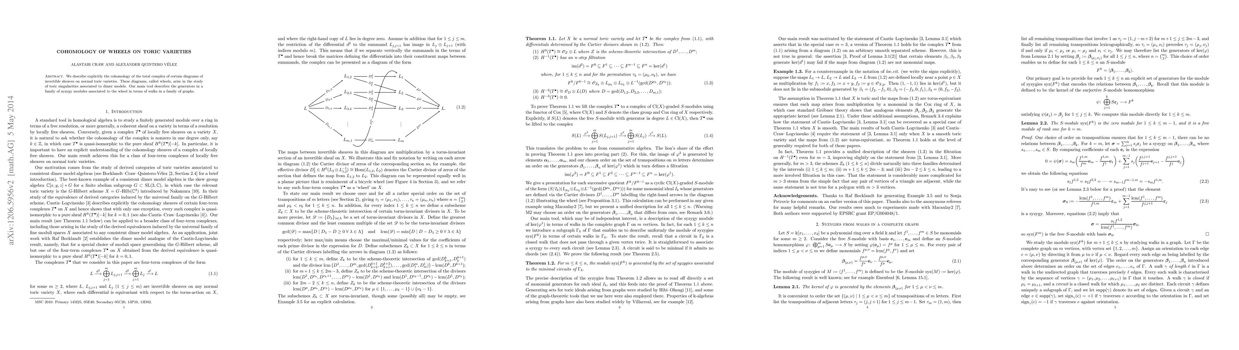Summary: This paper explicitly determines the cohomology of wheel diagrams—a specific configuration of invertible sheaves on normal toric varieties—utilizing syzygy modules and graph-theoretic walks to describe their generators, relevant to toric singularities linked with dimer models.