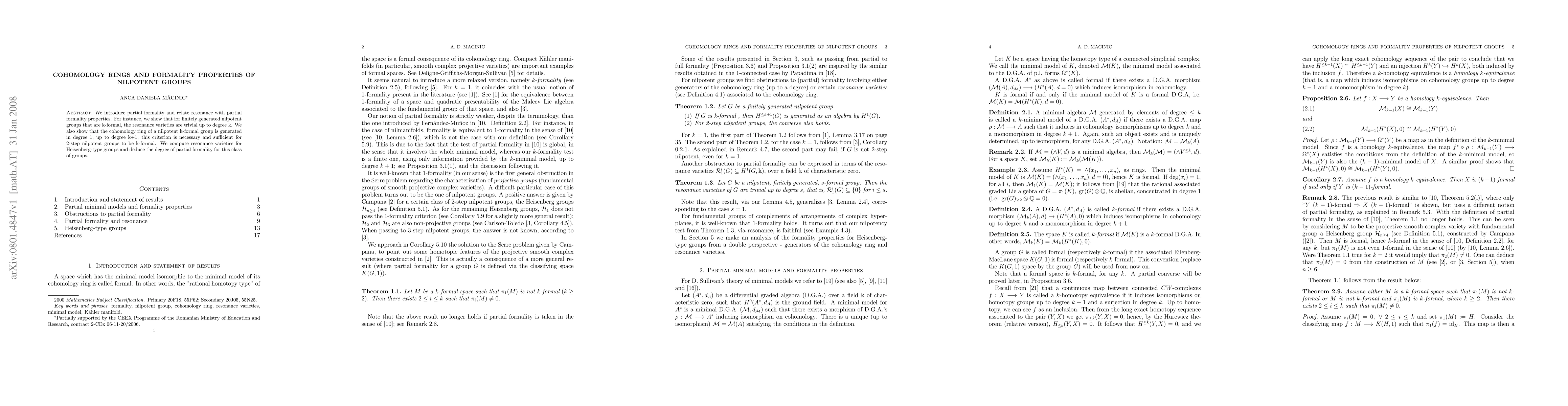 This paper establishes connections between partial formality and resonance properties in finitely generated nilpotent groups, proving that k-formal nilpotent groups have trivial resonance varieties up to degree k. It also shows that the cohomology ring of such groups is generated in degree 1 up to degree k+1, and computes resonance varieties for Heisenberg-type groups to determine their degree of partial formality.