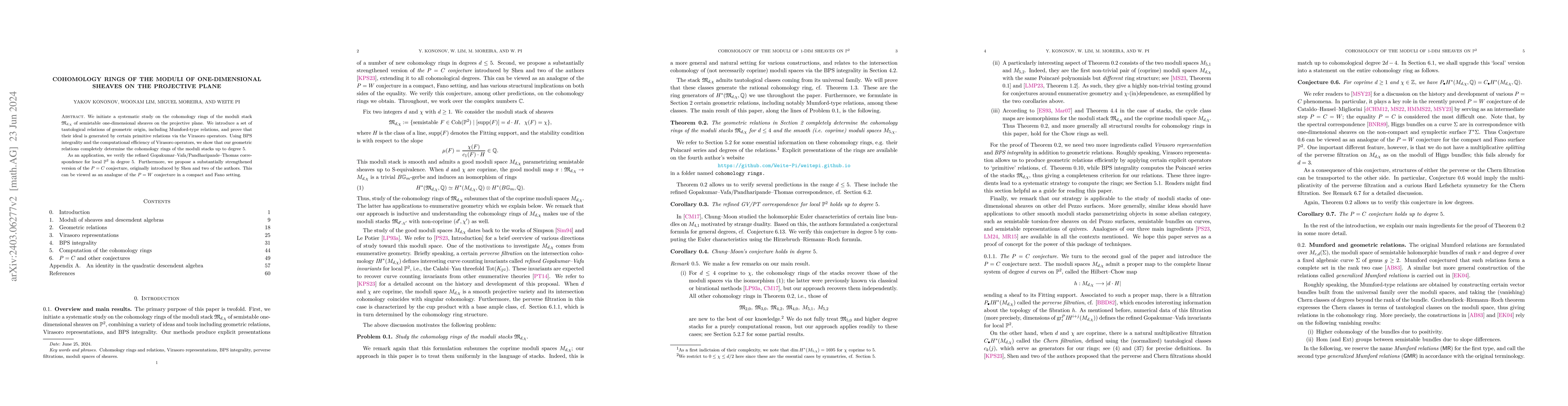 We initiate a systematic study on the cohomology rings of the moduli stack $\mathfrak{M}_{d,\chi}$ of semistable one-dimensional sheaves on the projective plane. We introduce a set of tautological relations of geometric origin, including Mumford-type relations, and prove that their ideal is generated by certain primitive relations via the Virasoro operators. Using BPS integrality and the computational efficiency of Virasoro operators, we show that our geometric relations completely determine the cohomology rings of the moduli stacks up to degree 5. As an application, we verify the refined Gopakumar--Vafa/Pandharipande--Thomas correspondence for local $\mathbb{P}^2$ in degree 5. Furthermore, we propose a substantially strengthened version of the $P=C$ conjecture, originally introduced by Shen and two of the authors. This can be viewed as an analogue of the $P=W$ conjecture in a compact and Fano setting.