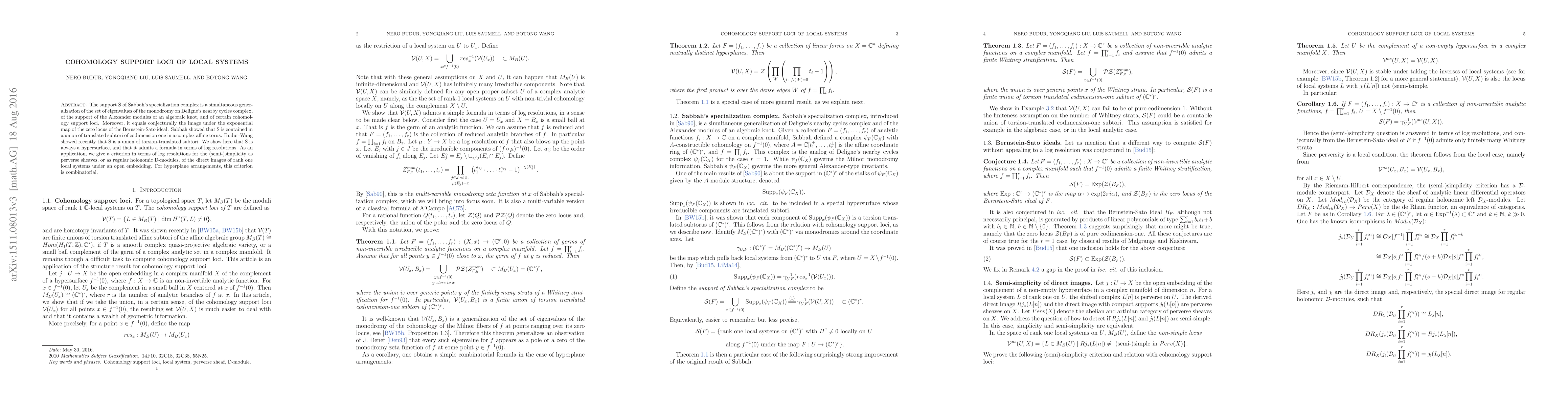 The support S of Sabbah's specialization complex is a simultaneous generalization of the set of eigenvalues of the monodromy on Deligne's nearby cycles complex, of the support of the Alexander modules of an algebraic knot, and of certain cohomology support loci. Moreover, it equals conjecturally the image under the exponential map of the zero locus of the Bernstein-Sato ideal. Sabbah showed that S is contained in a union of translated subtori of codimension one in a complex affine torus. Budur-Wang showed recently that S is a union of torsion-translated subtori. We show here that S is always a hypersurface, and that it admits a formula in terms of log resolutions. As an application, we give a criterion in terms of log resolutions for the (semi-)simplicity as perverse sheaves, or as regular holonomic D-modules, of the direct images of rank one local systems under an open embedding. For hyperplane arrangements, this criterion is combinatorial.