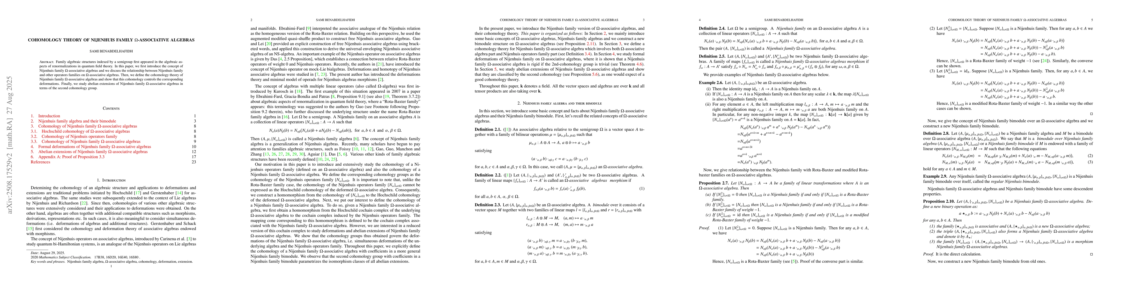 Family algebraic structures indexed by a semigroup first appeared in the algebraic aspects of renormalizations in quantum field theory. In this paper, we first introduce the concept of Nijenhuis family $\Omega$-associative algebras and we discuss the relationship between Nijenhuis family and other operators families on $\Omega$-associative algebras. Then, we define the cohomology theory of Nijenhuis family $\Omega$-associative algebras and show that this cohomology controls the corresponding deformations. Finally, we study abelian extensions of Nijenhuis family $\Omega$-associative algebras in terms of the second cohomology group.