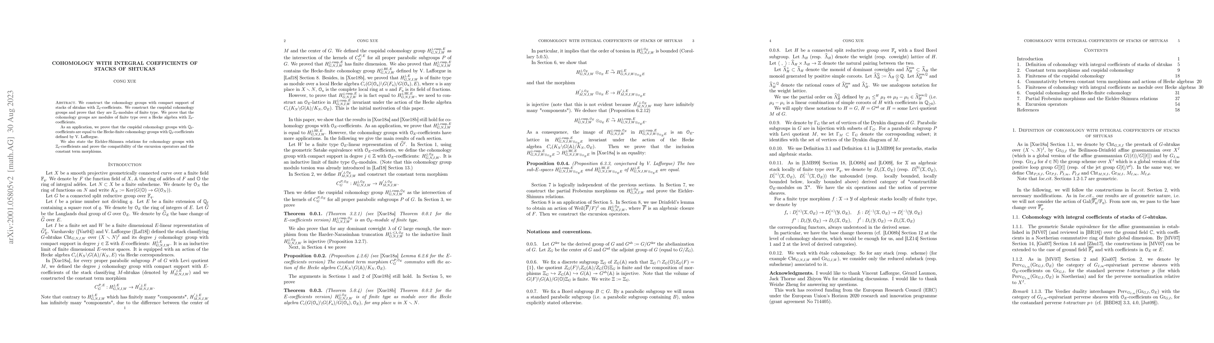 This paper constructs the cohomology groups with compact support of stacks of shtukas with $\mathbb Z_{\ell}$-coefficients, proving they are $\mathbb Z_{\ell}$-modules of finite type. It establishes the equality of cuspidal cohomology groups with $\mathbb Q_{\ell}$-coefficients to Hecke-finite cohomology groups defined by V. Lafforgue.