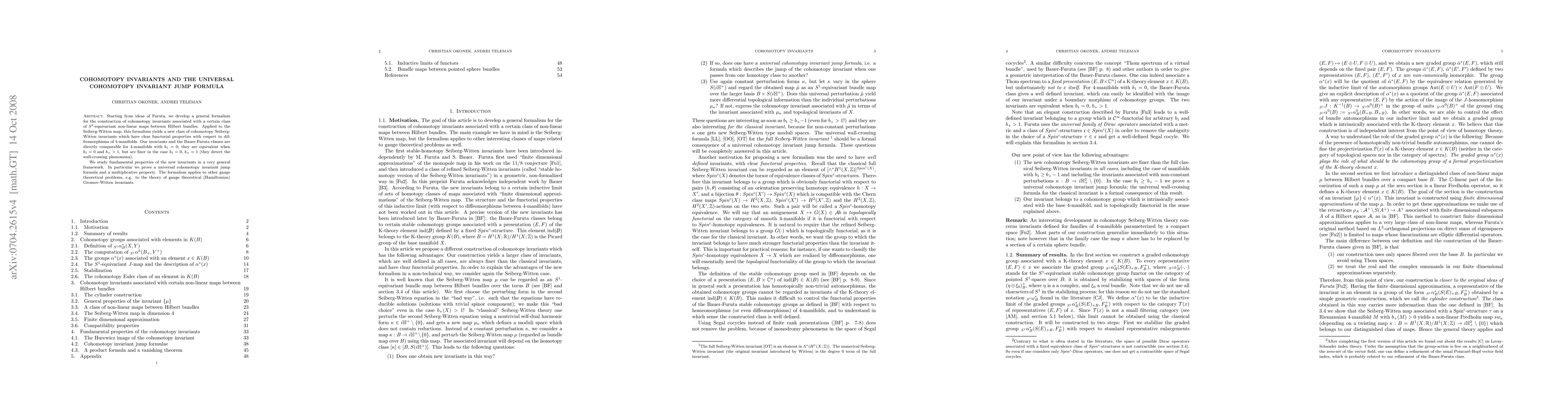 This paper develops a formalism for constructing cohomotopy invariants from $S^1$-equivariant non-linear maps between Hilbert bundles, yielding new Seiberg-Witten invariants with functorial properties. It proves a universal cohomotopy invariant jump formula and shows equivalence with Bauer-Furuta classes for certain 4-manifolds.