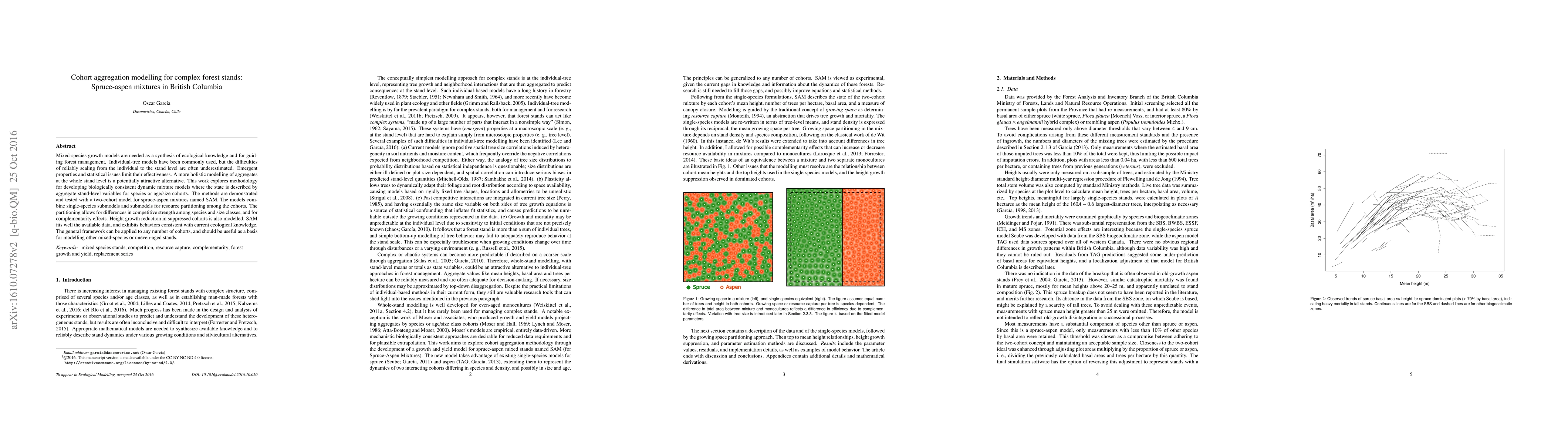 Mixed-species growth models are needed as a synthesis of ecological knowledge and for guiding forest management. Individual-tree models have been commonly used, but the difficulties of reliably scaling from the individual to the stand level are often underestimated. Emergent properties and statistical issues limit their effectiveness. A more holistic modelling of aggregates at the whole stand level is a potentially attractive alternative. This work explores methodology for developing biologically consistent dynamic mixture models where the state is described by aggregate stand-level variables for species or age/size cohorts. The methods are demonstrated and tested with a two-cohort model for spruce-aspen mixtures named SAM. The models combine single-species submodels and submodels for resource partitioning among the cohorts. The partitioning allows for differences in competitive strength among species and size classes, and for complementarity effects. Height growth reduction in suppressed cohorts is also modelled. SAM fits well the available data, and exhibits behaviors consistent with current ecological knowledge. The general framework can be applied to any number of cohorts, and should be useful as a basis for modelling other mixed-species or uneven-aged stands.