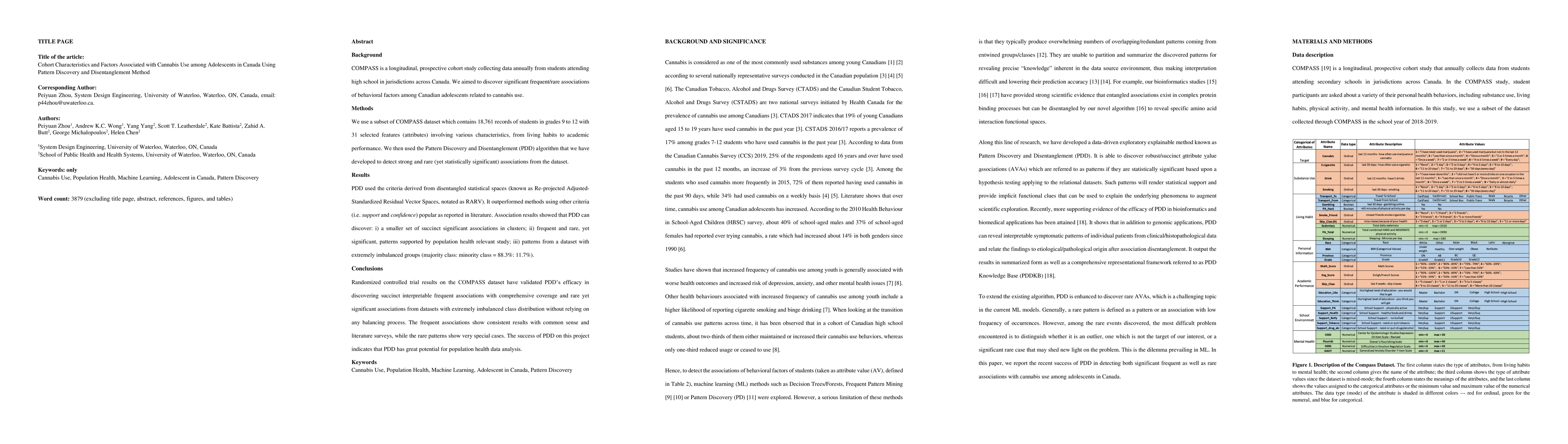 COMPASS is a longitudinal, prospective cohort study collecting data annually from students attending high school in jurisdictions across Canada. We aimed to discover significant frequent/rare associations of behavioral factors among Canadian adolescents related to cannabis use. We use a subset of COMPASS dataset which contains 18,761 records of students in grades 9 to 12 with 31 selected features (attributes) involving various characteristics, from living habits to academic performance. We then used the Pattern Discovery and Disentanglement (PDD) algorithm that we have developed to detect strong and rare (yet statistically significant) associations from the dataset. PDD used the criteria derived from disentangled statistical spaces (known as Re-projected Adjusted-Standardized Residual Vector Spaces, notated as RARV). It outperformed methods using other criteria (i.e. support and confidence) popular as reported in the literature. Association results showed that PDD can discover: i) a smaller set of succinct significant associations in clusters; ii) frequent and rare, yet significant, patterns supported by population health relevant study; iii) patterns from a dataset with extremely imbalanced groups (majority class: minority class = 88.3%: 11.7%).