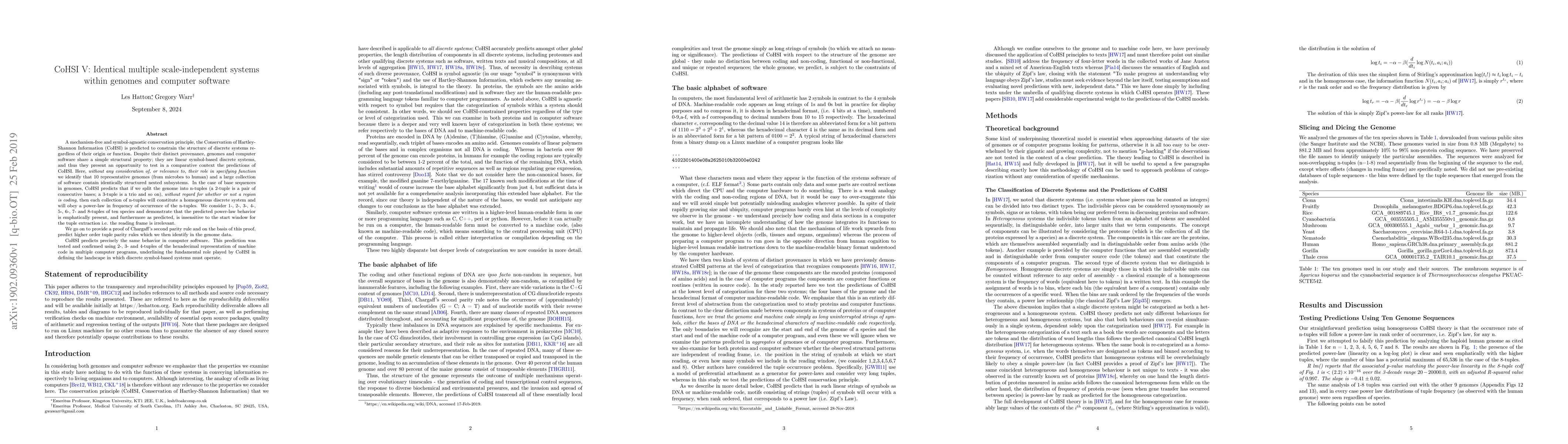 Genomes and computer software share identical structural properties as linear symbol-based discrete systems, adhering to a power-law behavior predicted by the Conservation of Hartley-Shannon Information (CoHSI) principle.