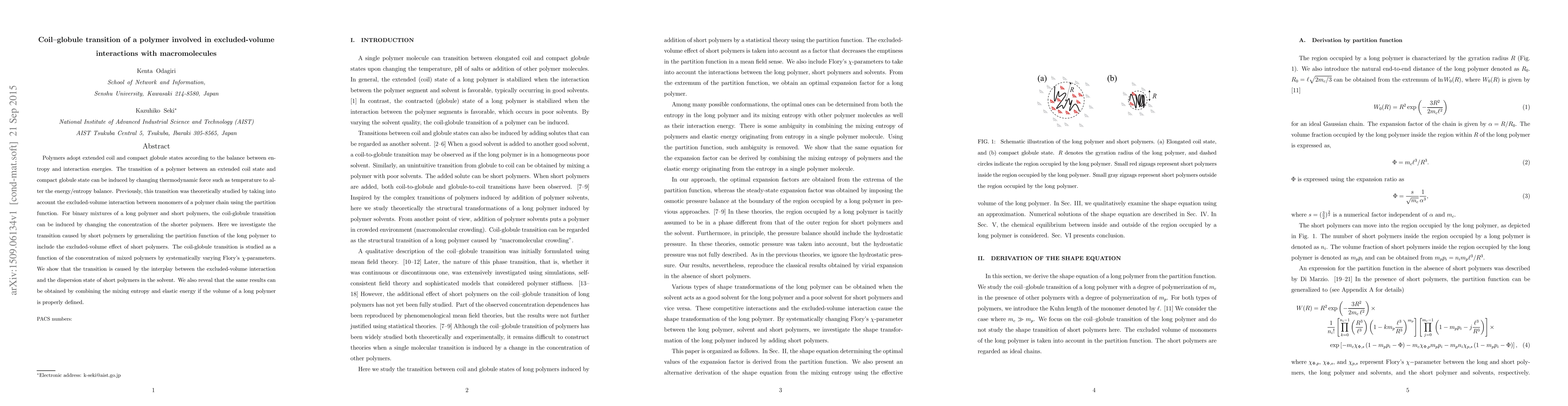 This paper investigates the coil-globule transition in a long polymer influenced by the excluded-volume interactions with short polymers, demonstrating how the transition depends on the concentration of the shorter polymers and Flory's chi-parameters, revealing the interplay between these interactions and the polymer's dispersion state.