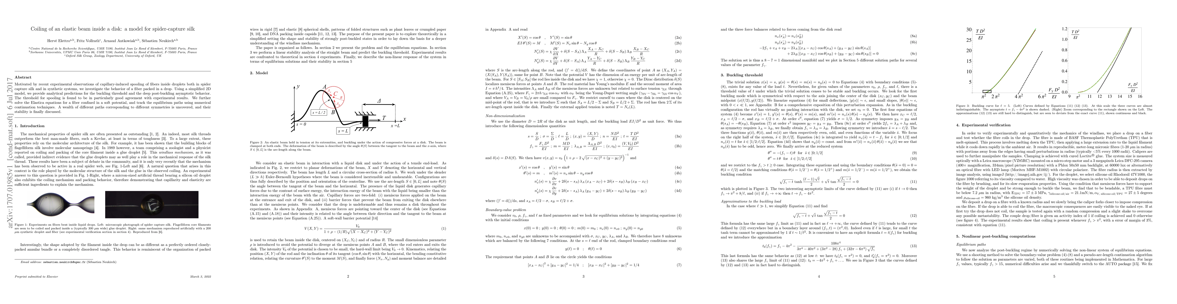 This paper models the coiling of an elastic beam within a disk to simulate the spooling behavior of spider capture silk, providing analytical predictions for buckling thresholds and post-buckling behavior. The study uncovers various equilibrium paths and discusses their stability, aligning well with experimental observations.