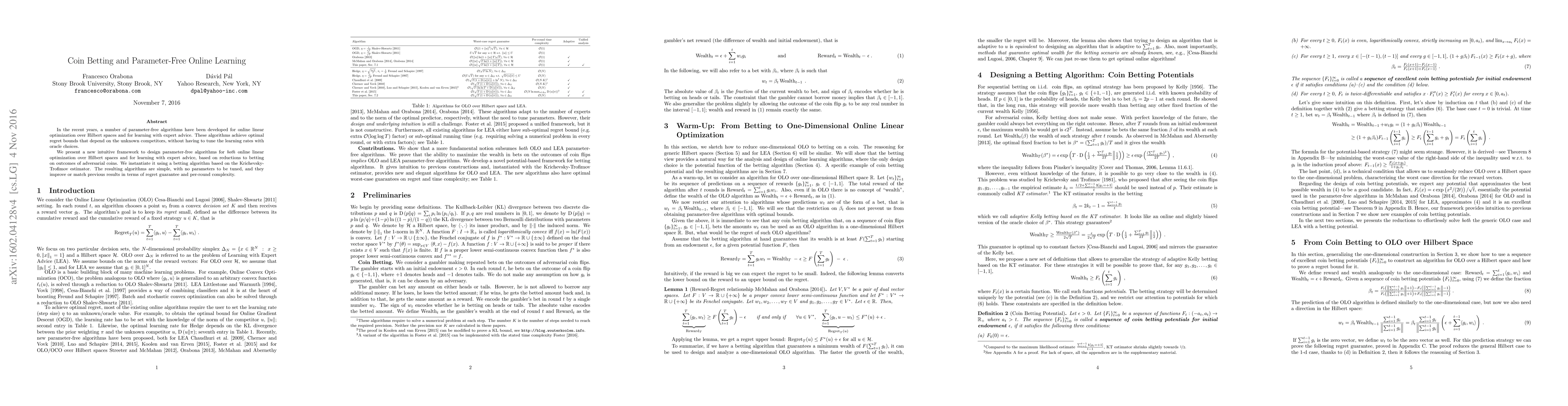 In the recent years, a number of parameter-free algorithms have been developed for online linear optimization over Hilbert spaces and for learning with expert advice. These algorithms achieve optimal regret bounds that depend on the unknown competitors, without having to tune the learning rates with oracle choices. We present a new intuitive framework to design parameter-free algorithms for \emph{both} online linear optimization over Hilbert spaces and for learning with expert advice, based on reductions to betting on outcomes of adversarial coins. We instantiate it using a betting algorithm based on the Krichevsky-Trofimov estimator. The resulting algorithms are simple, with no parameters to be tuned, and they improve or match previous results in terms of regret guarantee and per-round complexity.