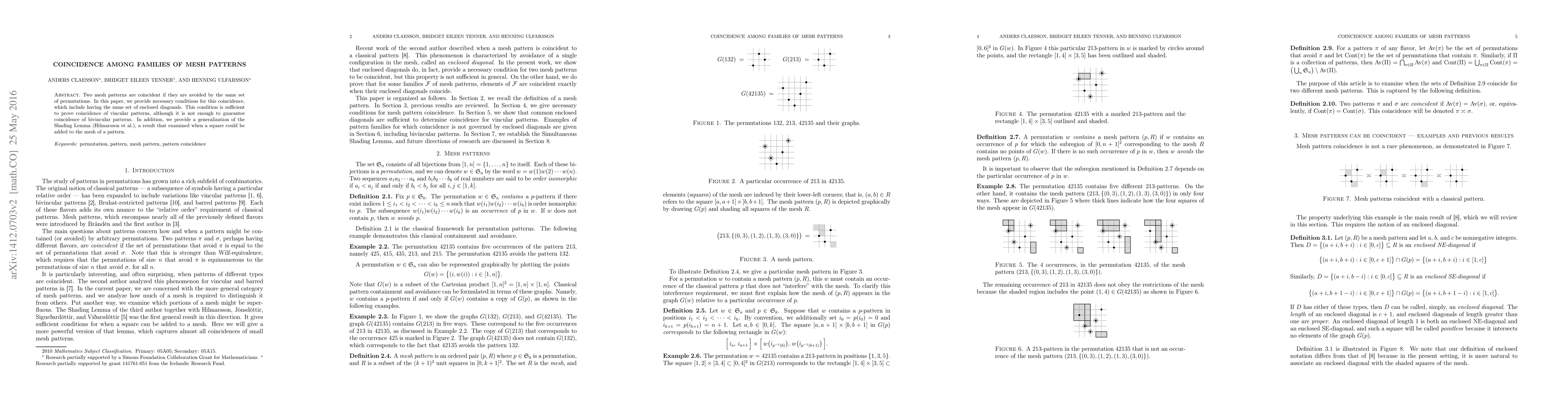 This paper explores the conditions under which two mesh patterns are coincident, specifically focusing on the requirement of the same set of enclosed diagonals. It also generalizes the Shading Lemma to further understand the addition of squares to mesh patterns.