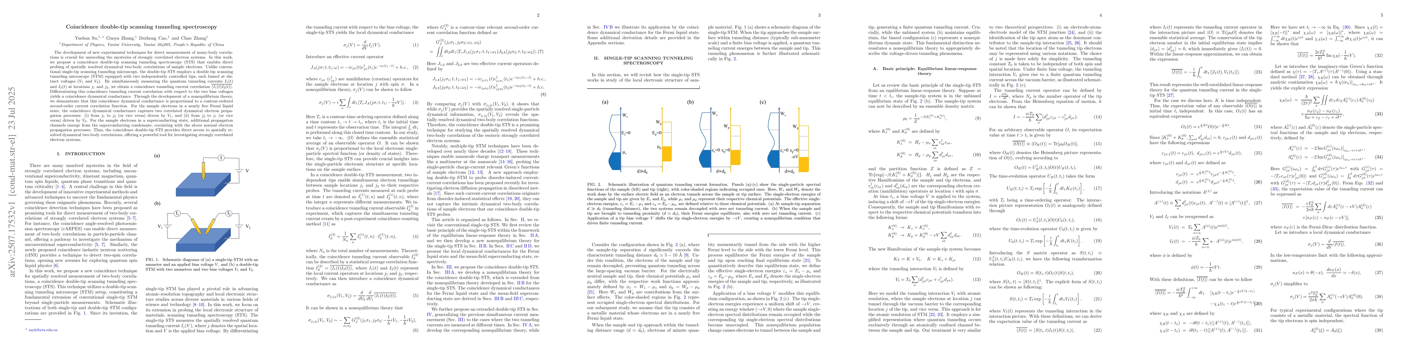 The development of new experimental techniques for direct measurement of many-body correlations is crucial for unraveling the mysteries of strongly correlated electron systems. In this work, we propose a coincidence double-tip scanning tunneling spectroscopy (STS) that enables direct probing of spatially resolved dynamical two-body correlations of sample electrons. Unlike conventional single-tip scanning tunneling microscopy, the double-tip STS employs a double-tip scanning tunneling microscope (STM) equipped with two independently controlled tips, each biased at distinct voltages ($V_1$ and $V_2$). By simultaneously measuring the quantum tunneling currents $I_1(t)$ and $I_2(t)$ at locations $j_1$ and $j_2$, we obtain a coincidence tunneling current correlation $\overline{\langle I_1(t) I_2(t)\rangle}$. Differentiating this coincidence tunneling current correlation with respect to the two bias voltages yields a coincidence dynamical conductance. Through the development of a nonequilibrium theory, we demonstrate that this coincidence dynamical conductance is proportional to a contour-ordered second-order current correlation function. For the sample electrons in a nearly free Fermi liquid state, the coincidence dynamical conductance captures two correlated dynamical electron propagation processes: (i) from $j_1$ to $j_2$ (or vice versa) driven by $V_1$, and (ii) from $j_2$ to $j_1$ (or vice versa) driven by $V_2$. For the sample electrons in a superconducting state, additional propagation channels emerge from the superconducting condensate, coexisting with the above normal electron propagation processes. Thus, the coincidence double-tip STS provides direct access to spatially resolved dynamical two-body correlations, offering a powerful tool for investigating strongly correlated electron systems.