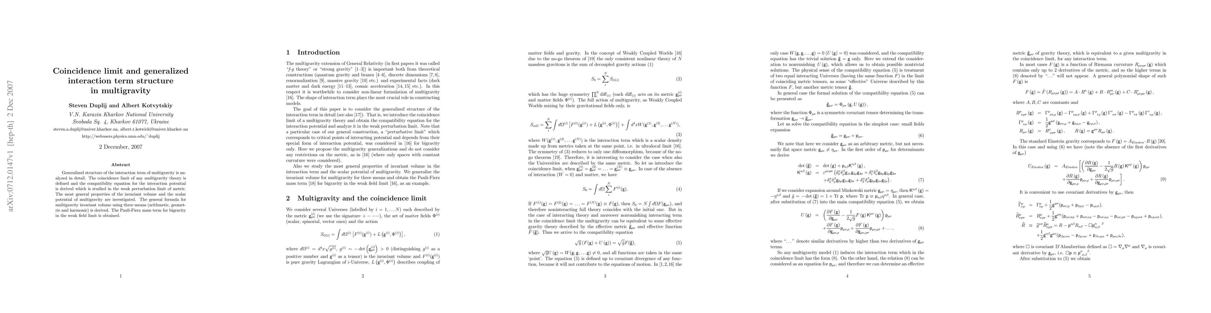 Generalized structure of the interaction term of multigravity is analyzed in detail. The coincidence limit of any multigravity theory is defined and the compatibility equation for the interaction potential is derived which is studied in the weak perturbation limit of metric. The most general properties of the invariant volume and the scalar potential of multigravity are investigated. The general formula for multigravity invariant volume using three means (arithmetic, geometric and harmonic) is derived. The Pauli-Fierz mass term for bigravity in the weak field limit is obtained.