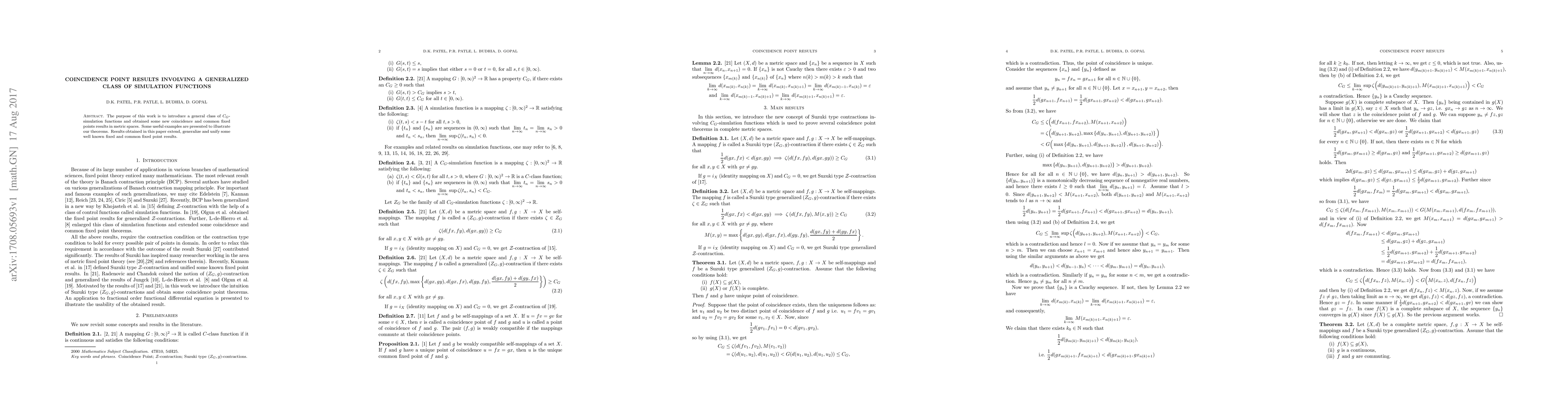 The purpose of this work is to introduce a general class of $C_G$-simulation functions and obtained some new coincidence and common fixed points results in metric spaces. Some useful examples are presented to illustrate our theorems. Results obtained in this paper extend, generalize and unify some well known fixed and common fixed point results.