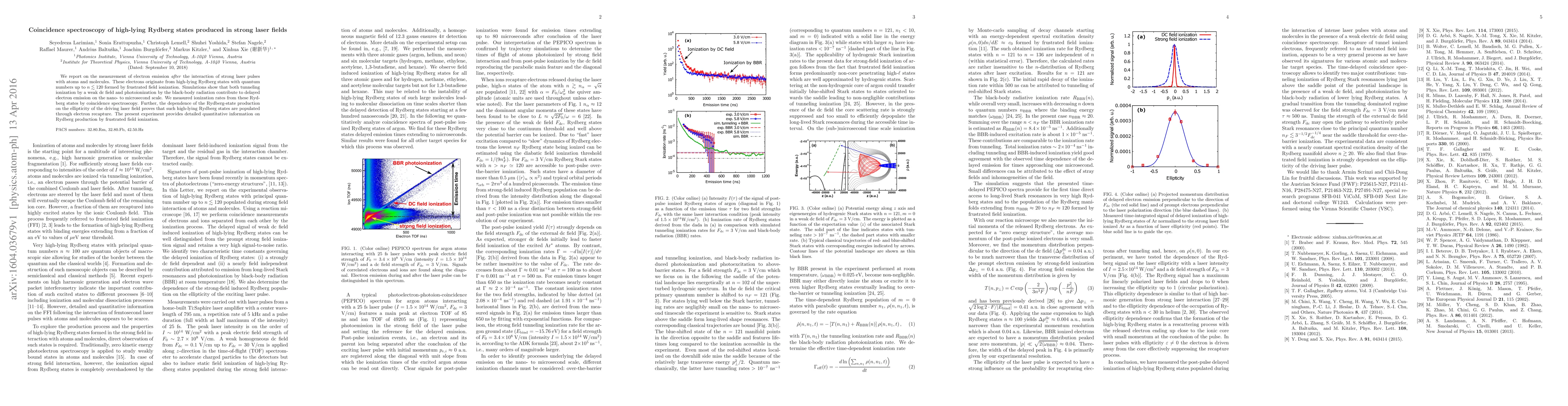 This research measures electron emission from high-lying Rydberg states ($n \lesssim 120$) formed via frustrated field ionization in strong laser fields, using coincidence spectroscopy to determine ionization rates. The study reveals that both tunneling ionization and photoionization contribute to delayed electron emission, and it finds that high-lying Rydberg states are populated through electron recapture, as shown by the dependence on the laser field's ellipticity.