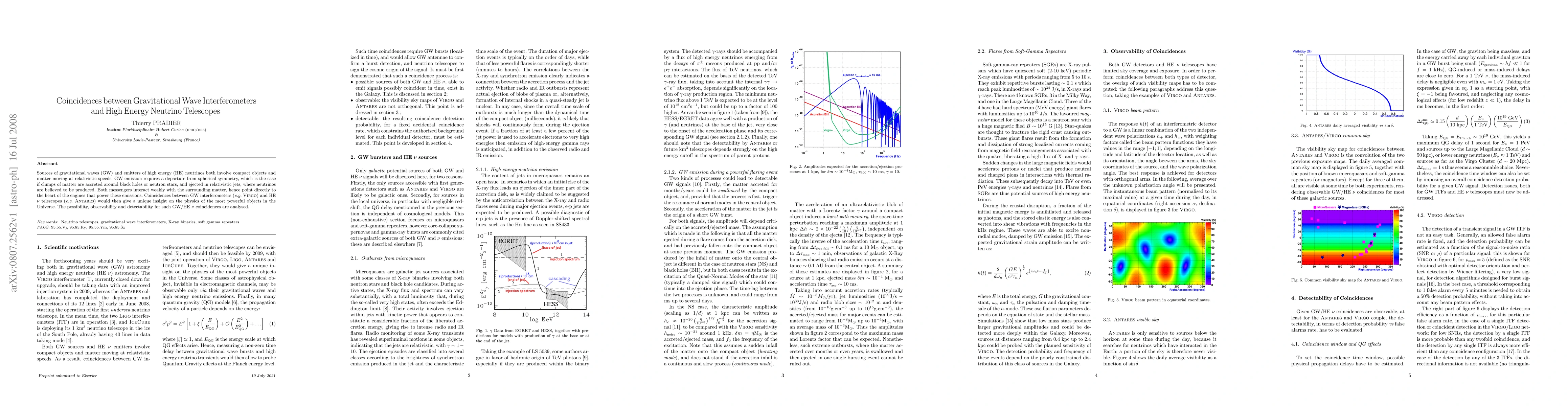 Sources of gravitational waves (GW) and emitters of high energy (HE) neutrinos both involve compact objects and matter moving at relativistic speeds. GW emission requires a departure from spherical symmetry, which is the case if clumps of matter are accreted around black holes or neutron stars, and ejected in relativistic jets, where neutrinos are believed to be produced. Both messengers interact weakly with the surrounding matter, hence point directly to the heart of the engines that power these emissions. Coincidences between GW interferometers (e.g. Virgo) and HE neutrino telescopes (e.g. Antares) would then give a unique insight on the physics of the most powerful objects in the Universe. The possibility, observability and detectability for such GW/HE neutrino coincidences are analysed.