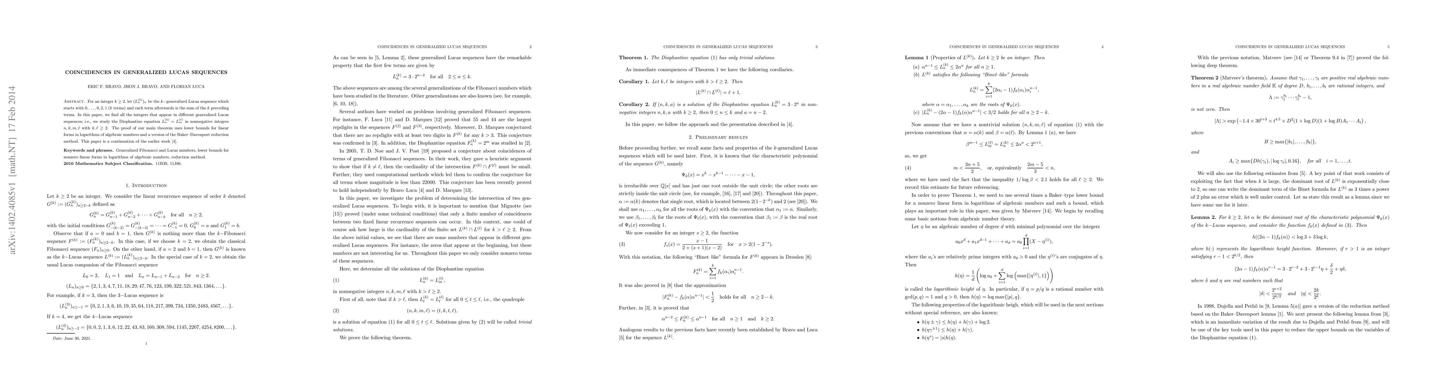 This paper investigates integers that coincide in different generalized Lucas sequences, solving the Diophantine equation $L_n^{(k)}=L_m^{(\ell)}$ for nonnegative integers $n, k, m, \ell$ with $k, \ell\geq 2$. The proof leverages lower bounds for linear forms in logarithms and a Baker-Davenport reduction method.