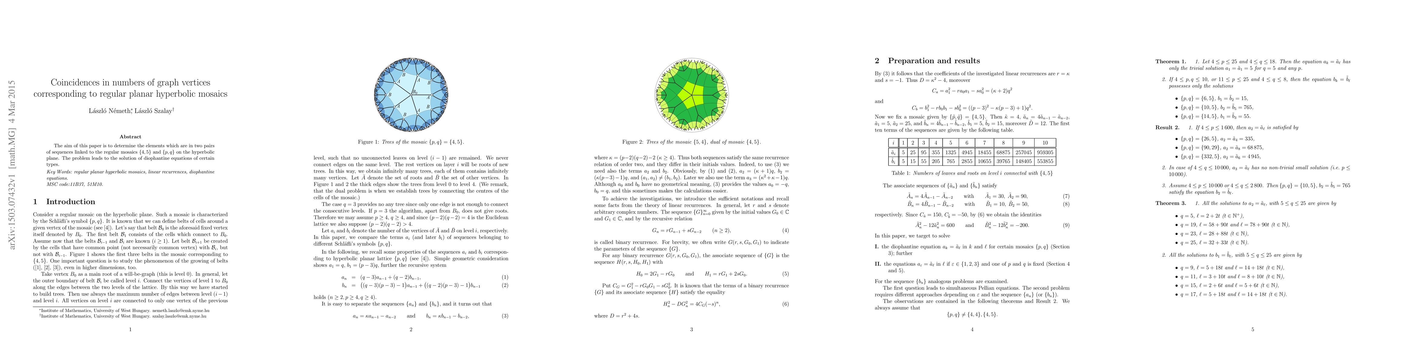 Summary: This paper investigates coincidences between sequences related to regular planar hyperbolic mosaics, specifically $\{4,5\}$ and $\{p,q\}$, and solves associated diophantine equations to identify common elements.