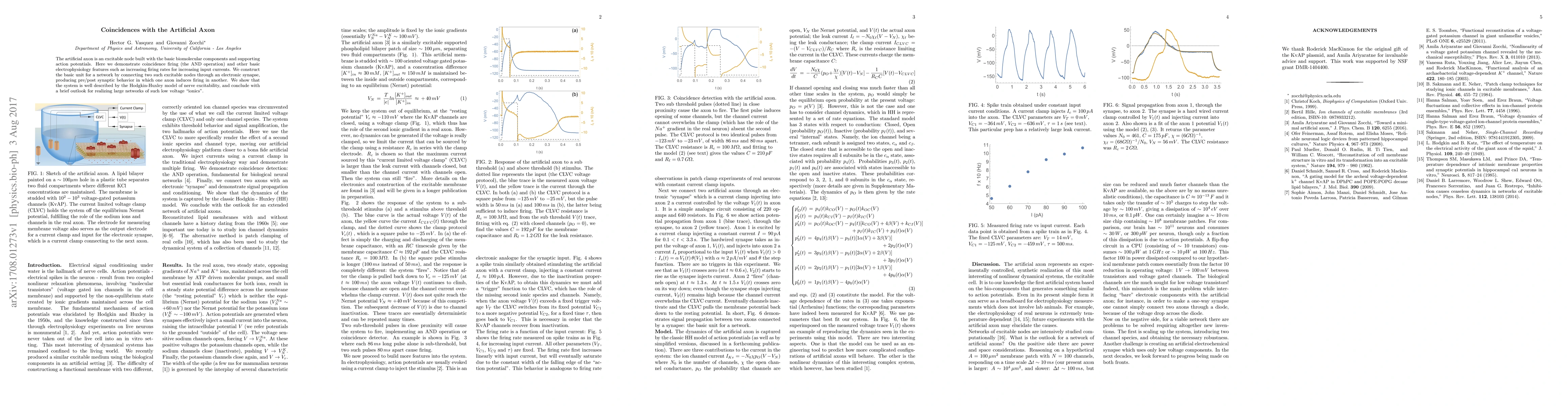 This paper demonstrates the functionality of an artificial axon capable of coincidence firing and basic electrophysiological behaviors, akin to natural neurons. By connecting two excitable nodes with an electronic synapse, the study shows pre/post synaptic interactions and validates the system's behavior with the Hodgkin-Huxley model, suggesting potential for large networks of low voltage "ionics".