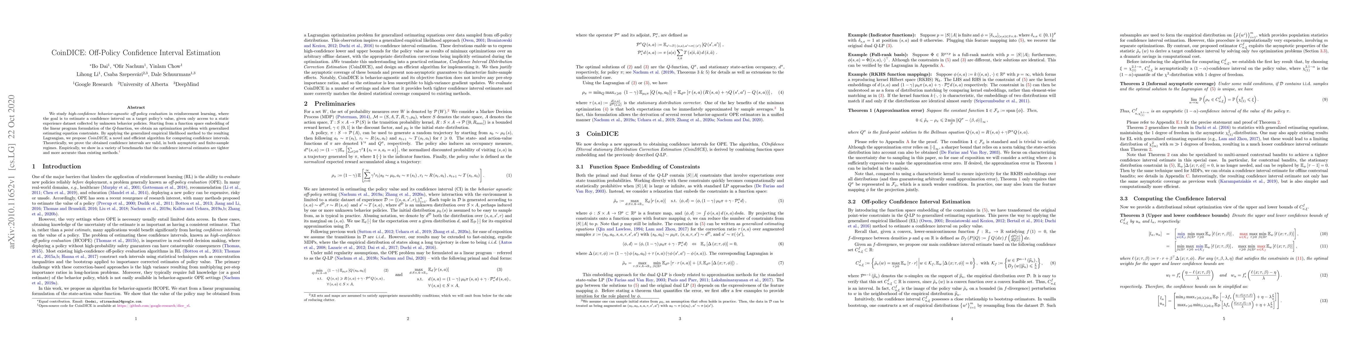 CoinDICE proposes a novel algorithm for off-policy confidence interval estimation in reinforcement learning, leveraging generalized empirical likelihood for tighter and more accurate interval estimates compared to existing methods. Theoretical proofs ensure the validity of the confidence intervals in both large and small sample sizes.