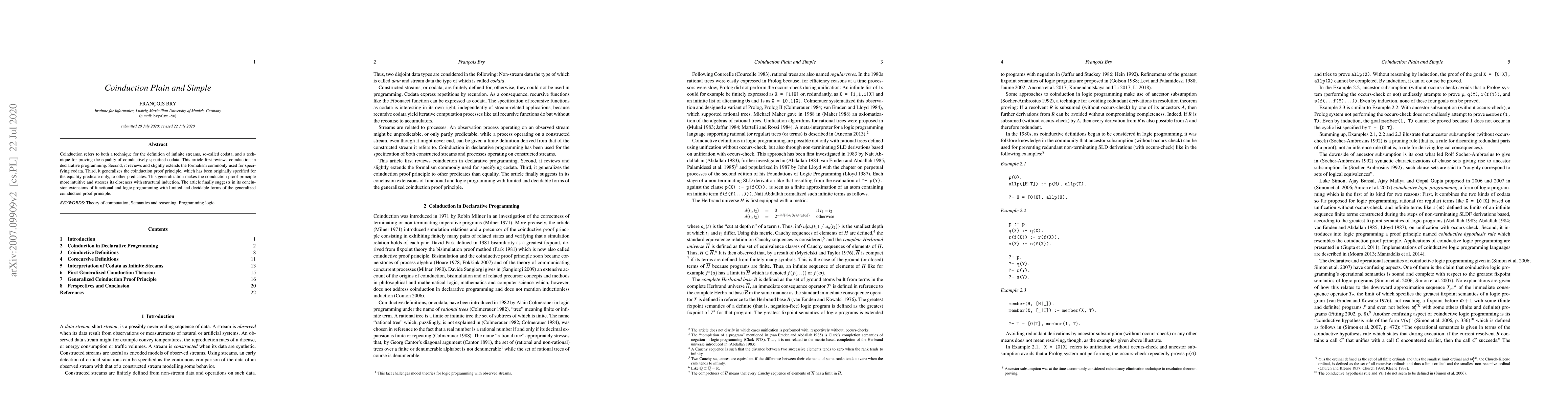 Coinduction refers to both a technique for the definition of infinite streams, so-called codata, and a technique for proving the equality of coinductively specified codata. This article first reviews coinduction in declarative programming. Second, it reviews and slightly extends the formalism commonly used for specifying codata. Third, it generalizes the coinduction proof principle, which has been originally specified for the equality predicate only, to other predicates. This generalization makes the coinduction proof principle more intuitive and stresses its closeness with structural induction. The article finally suggests in its conclusion extensions of functional and logic programming with limited and decidable forms of the generalized coinduction proof principle.